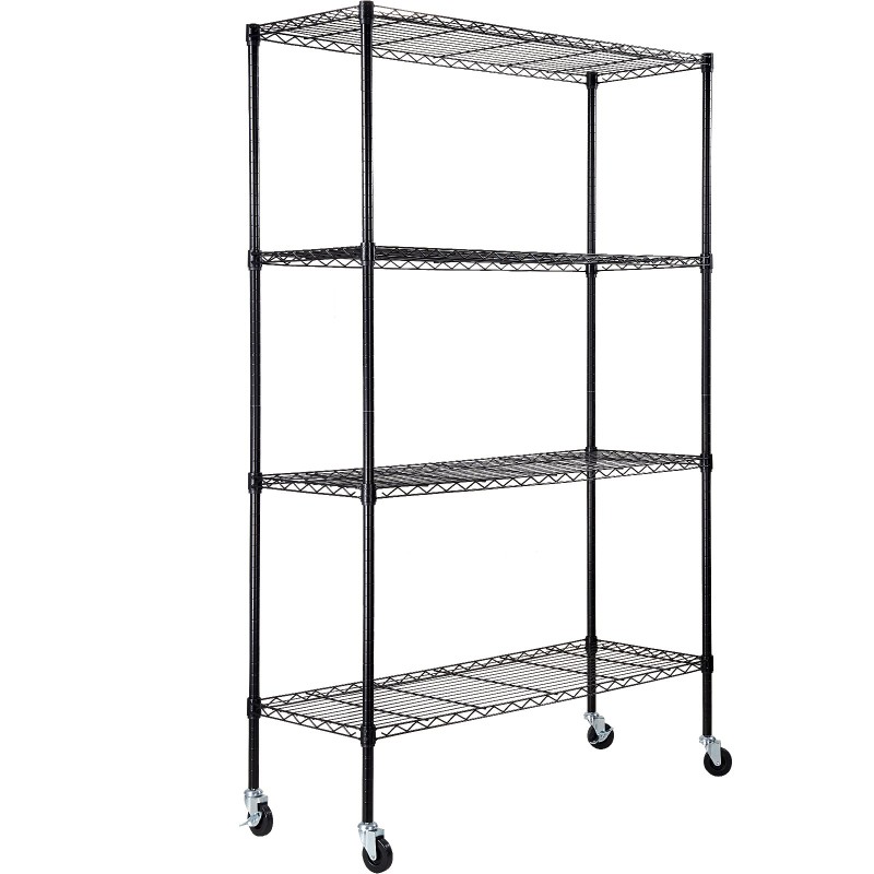 Vankka nelitasoinen metallihylly pyörillä, helposti liikuteltava: säädettävät tasot ja korkeus, 175 lbs per taso, jauhemaalattu pinta, pultiton kokoaminen, kestävä ja luotettava kotiin ja varastoon.