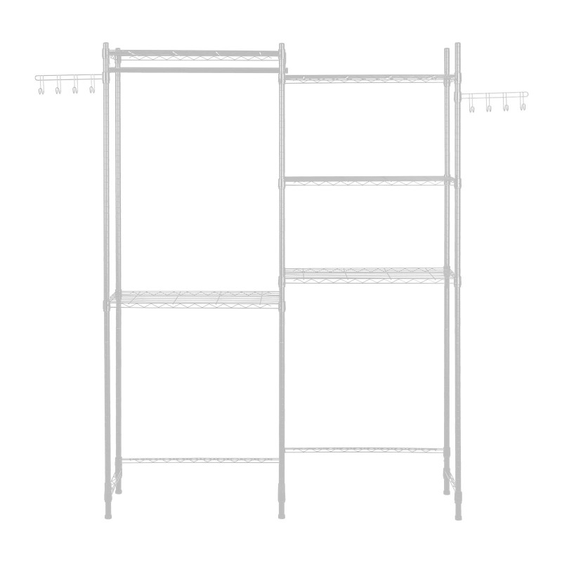 Yhdessä rungossa on ripustustanko, säädettävät hyllyt ja pyörivät koukut, joten samassa paikassa voi säilyttää pesuaineet, pyyhkeet ja ripustaa pyykit kuivumaan. Ratkaisu sopii kodinhoitohuoneeseen, kylpyhuoneeseen tai muuhun vastaavaan tilaan.