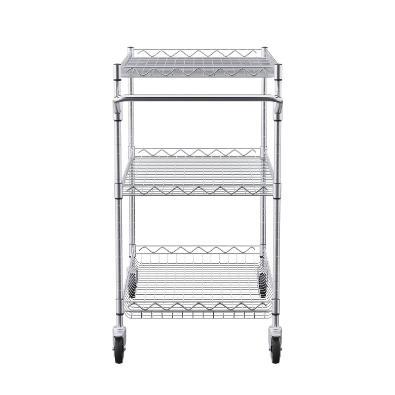 Tämä 3-tasoinen metallinen palvelu- ja säilytyskärry helpottaa tavaroiden siirtämistä ja järjestämistä keittiössä, toimistossa, varastossa tai ulkokäytössä. Syvät, verkkopohjaiset korihyllyt pitävät tavarat tukevasti paikallaan, ja teräsrakenne kestää raskastakin kuormitusta.