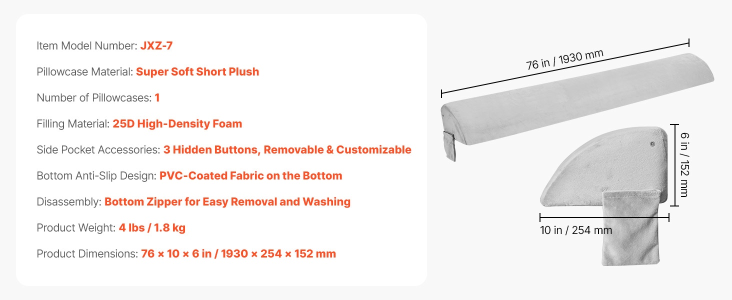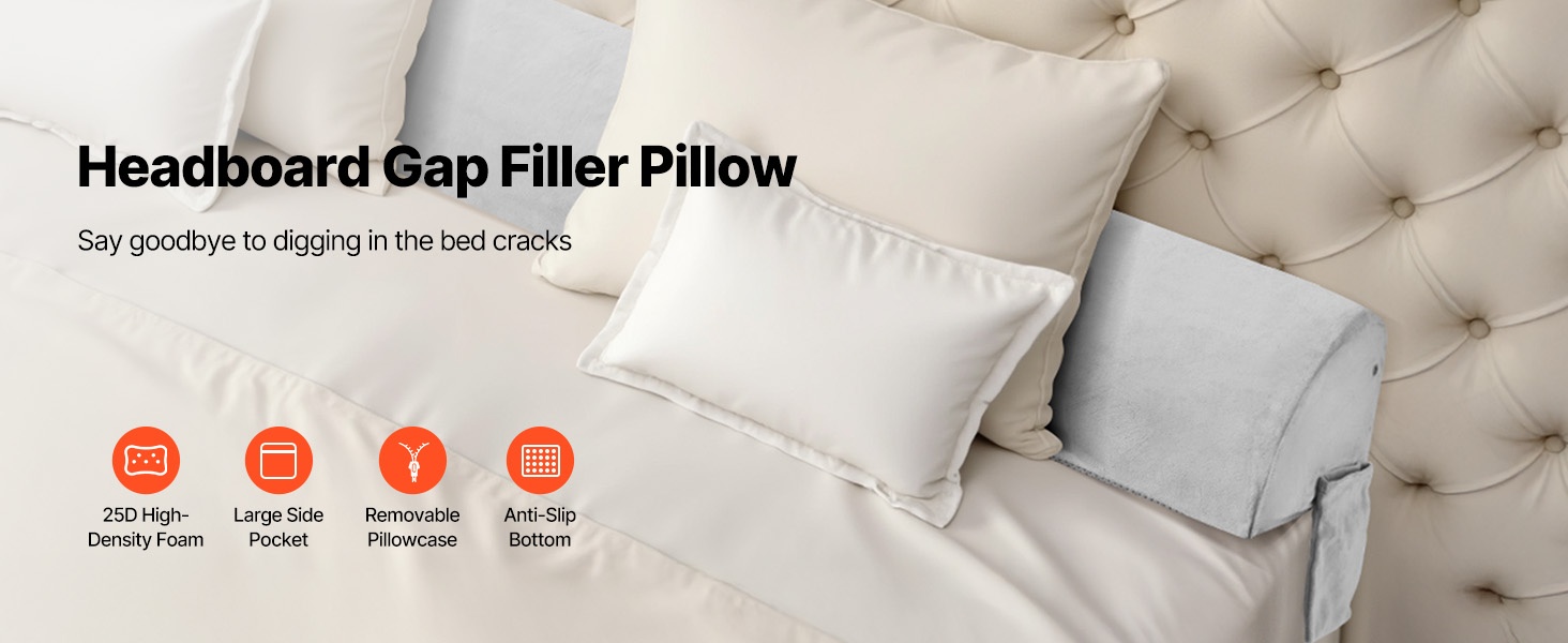 Tämä vuoteen rakojen täyttötyyny auttaa täyttämään sängynpäädyn ja patjan välisen raon, jotta tyynyt ja pienet tavarat eivät putoa väliin. 25D korkeatiheyksinen vaahto tarjoaa pehmeän mutta tukevan tuen selälle ja päälle, ja irrotettava päällinen sekä liukuestepohja tekevät käytöstä huolettoman.