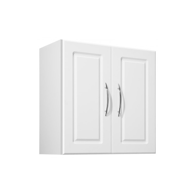 Seinään asennettava valkoinen kaksitasoinen kaappi säädettävällä hyllyllä lastulevystä ja MDF-levystä