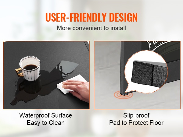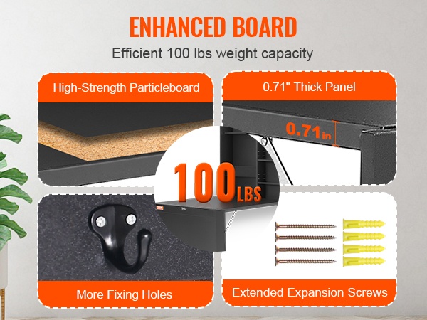 Seinään kiinnitettävän taittopöydän runko on valmistettu kestävästä lastulevystä. 0.71-inch paksu pöytätaso kestää jopa 100 lbs kuorman. Pintakäsittely tekee pinnasta tasaisen ja miellyttävän käyttää sekä helpottaa päivittäistä puhtaanapitoa.