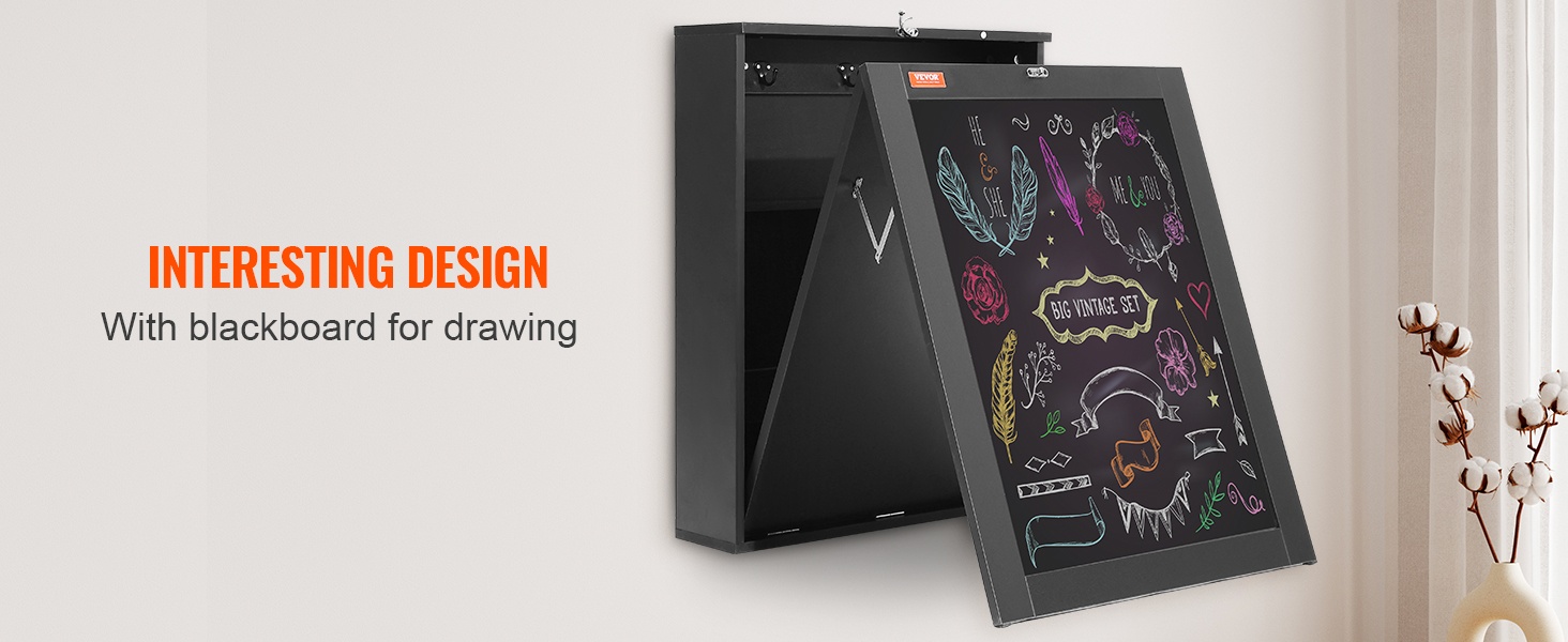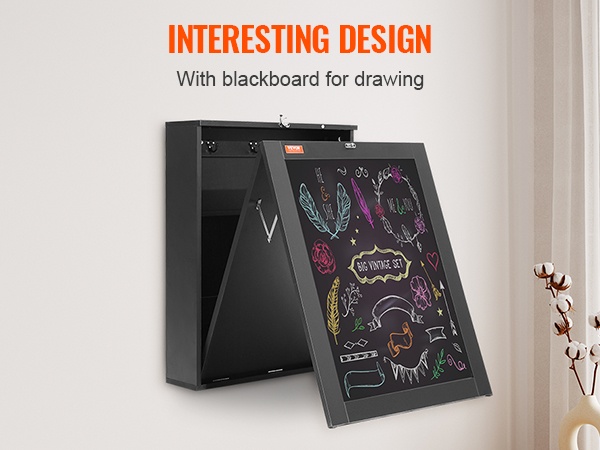 Taittopöydän ulkopinnalla on liitutaulu, joka sopii sekä aikuisille että lapsille. Suljettuna se toimii ilmoitustauluna, muistilistana tai piirustusalustana. Näin sama kaluste yhdistää käytännöllisyyden, säilytystilan ja luovan tekemisen yhteen kokonaisuuteen.
