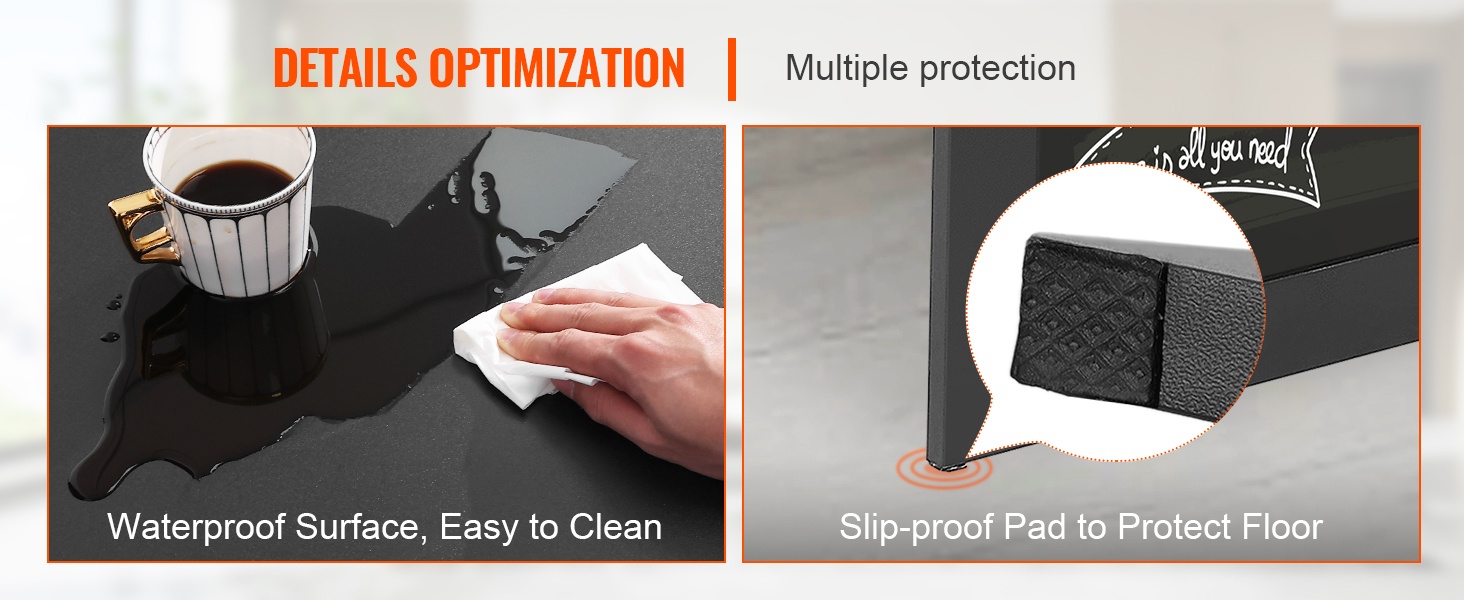 Vedenkestävä pöytäpinta on helppo pyyhkiä puhtaaksi. Pöydän jalkojen alla olevat liukuestepehmusteet suojaavat lattiaa naarmuilta ja parantavat samalla pöydän vakautta.