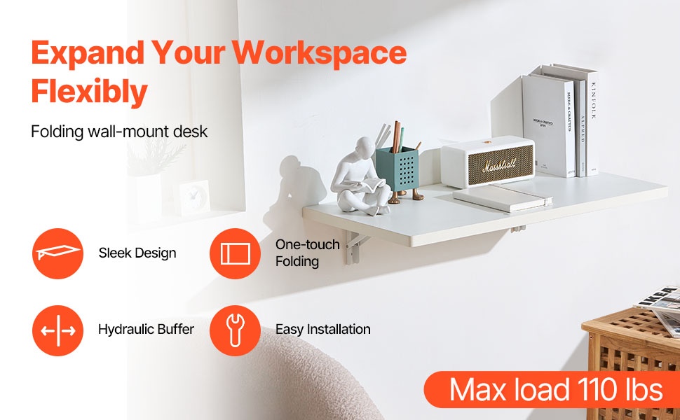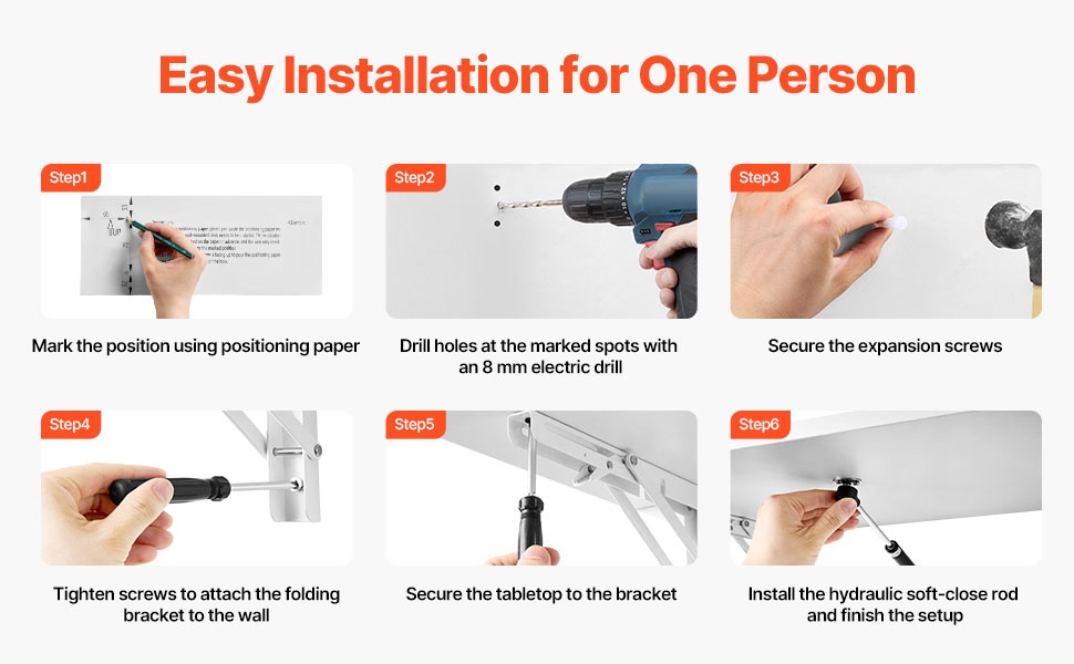 Kelluva pöytä on helppo asentaa mukana tulevan kohdistuspaperin avulla. Monimutkaisia työkaluja tai tarkkoja mittauksia ei tarvita – paperi kiinnitetään seinään ja asennus sujuu vaivattomasti, mikä vähentää asennusvirheiden riskiä.