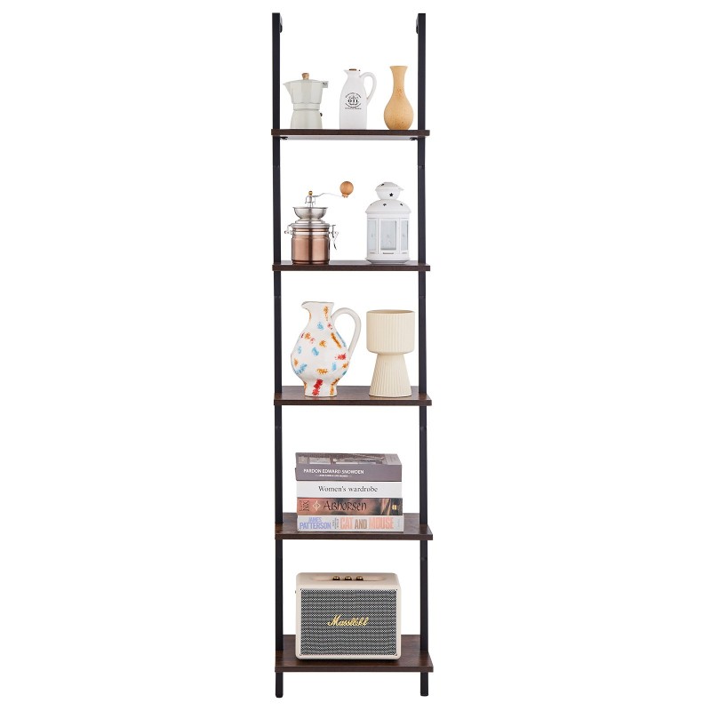 Tämä 5-tasoinen seinään kiinnitettävä tikashylly yhdistää metallirungon ja puuhyllyt, ja tarjoaa käytännöllistä säilytystilaa keittiöön, olohuoneeseen, makuuhuoneeseen tai kylpyhuoneeseen. Avoin rakenne helpottaa tavaroiden esillepanoa ja pitää arjen tarvikkeet käden ulottuvilla.