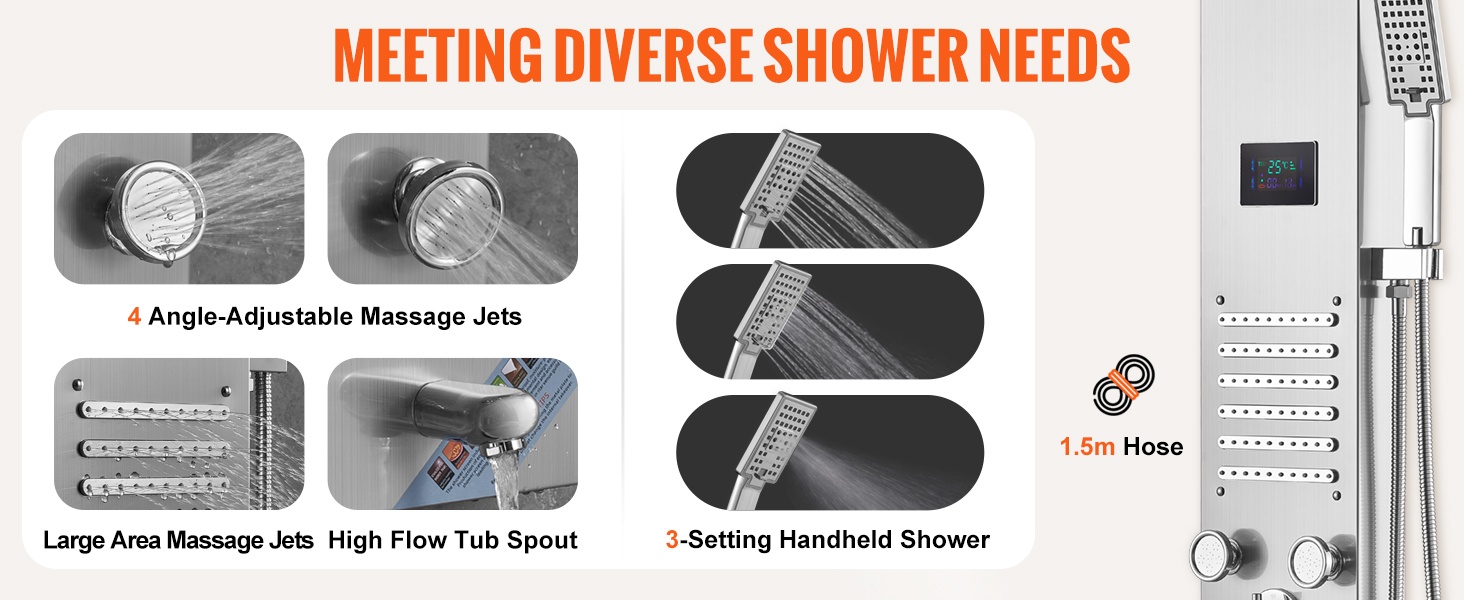 Hierontasuihkut on suunniteltu siten, etteivät ne kohdistu suoraan kasvoihin. Suihkujen kulmaa voi säätää eri pituuksille sopivaksi. 3-tilainen käsisuihku, jossa on 59 in / 1.5 m pituinen letku, sopii suihkussa käymiseen, kylpyhuoneen puhdistamiseen ja lemmikkien pesuun.