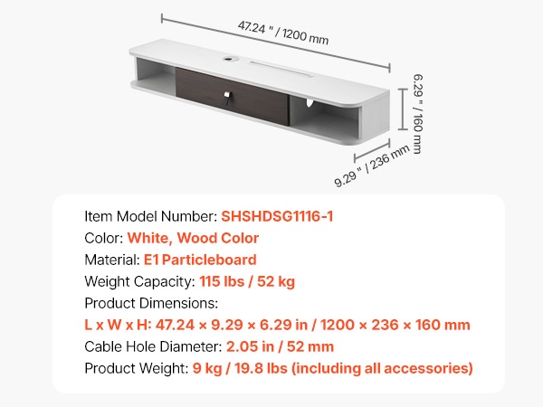 - Kaapelireiän halkaisija: 2.05 in / 52 mm