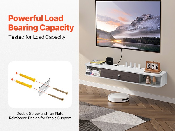 Rakenne on vahvistettu kaksoisruuveilla ja rautalevyillä, mikä parantaa tason vakautta ja kantavuutta. Taso on suunniteltu kestämään painavia laitteita, jotta televisio ja muut laitteet pysyvät tukevasti paikoillaan.