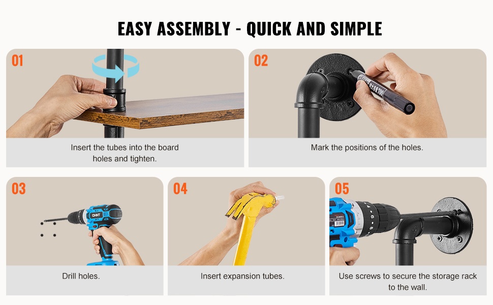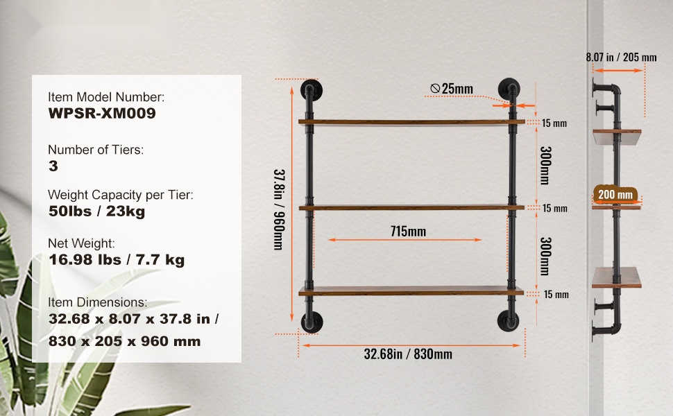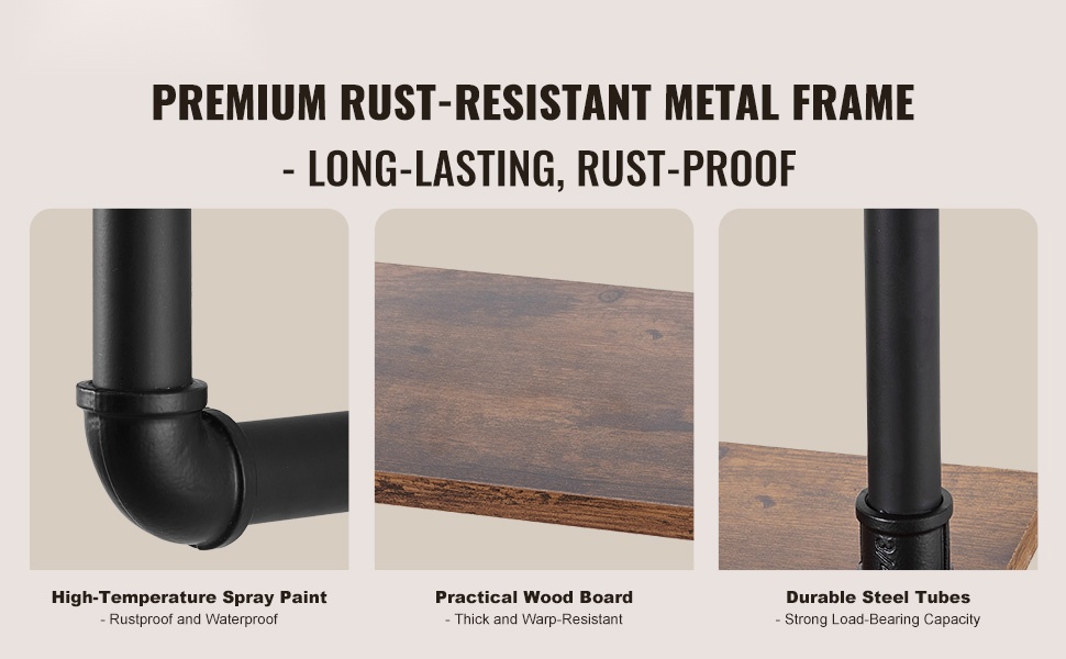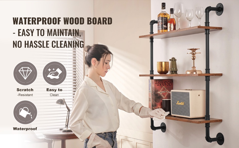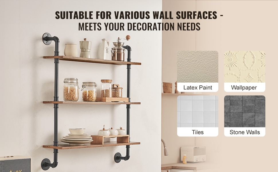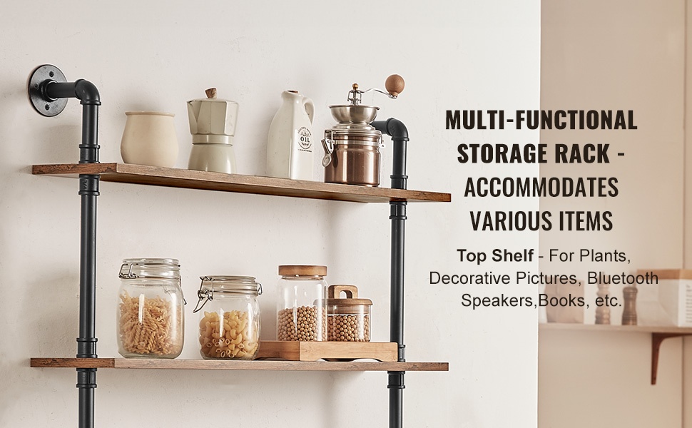 Tämä seinäkiinnitteinen metalliputkihylly auttaa hyödyntämään seinäpinnan tehokkaasti keittiössä, olohuoneessa, makuuhuoneessa, kylpyhuoneessa tai työhuoneessa. Kolme tasoa tarjoavat tilaa kirjoille, koristeille, astioille ja muille arjen tarvikkeille, ja pelkistetty teollinen tyyli sopii monenlaiseen sisustukseen.