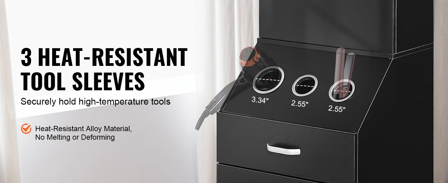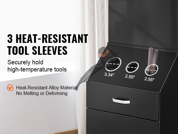Lämpöä kestävästä seosmateriaalista valmistetut työkaluholkit mahdollistavat erilaisten kuumien muotoiluvälineiden, kuten hiustenkuivaajien ja muotoilurautojen, turvallisen säilytyksen. Holkkien pohjakannet estävät työkalujen putoamisen ja lisäävät työpisteen turvallisuutta.