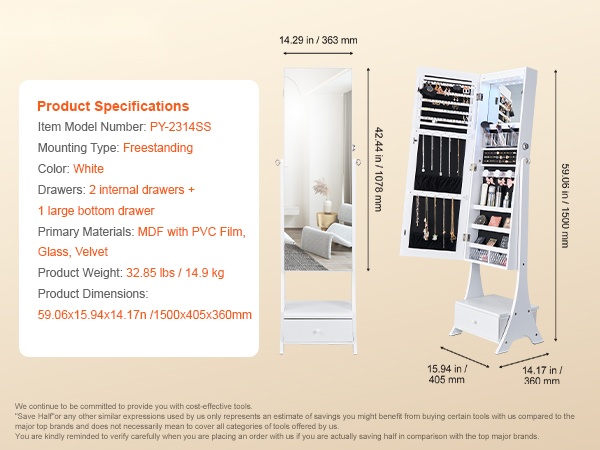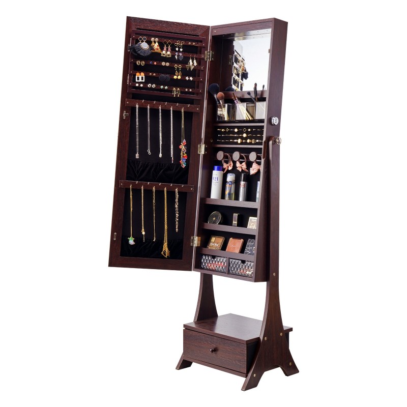 Tämä seisova peilikaappi tarjoaa yhdellä tuotteella useita toimintoja: korujen järjestäminen, täyspitkä pukeutumispeili, meikkipeili sekä taustapuolella oleva säilytystaso. Ratkaisu auttaa pitämään kauneustuotteet, korut ja pienet asusteet yhdessä paikassa ja helposti saatavilla.