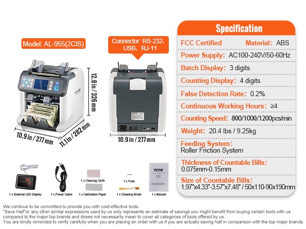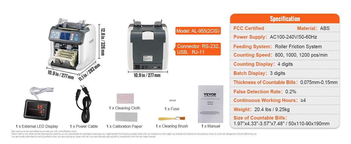 Tämä setelilaskuri helpottaa käteiskassan hoitoa kaupoissa, ravintoloissa, huoltoasemilla ja muissa yrityksissä. Laite laskee nopeasti suuretkin setelimäärät, tunnistaa epäaidot setelit ja näyttää tulokset selkeältä näytöltä sekä erilliseltä lisänäytöltä.