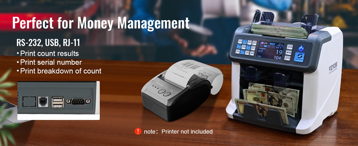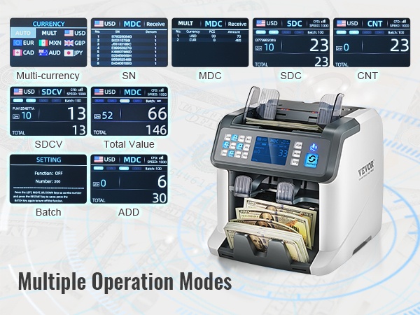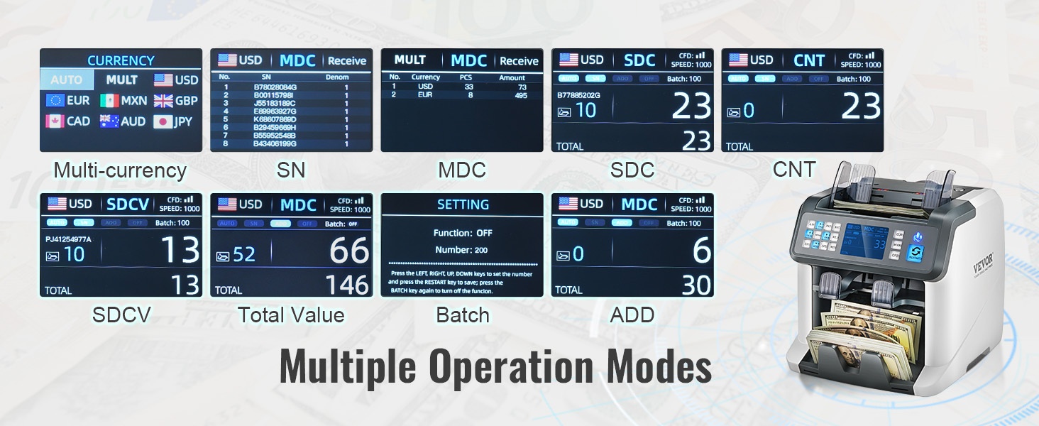 Setelilaskuri käsittelee sekä USD- että EUR-seteleitä ja tarjoaa useita työtiloja eri tilanteisiin: tavallinen laskenta, kokonaisarvon laskenta, lisäystoiminto, erälaskenta sekä automaattinen ja manuaalinen käynnistys. Näin sama laite sopii sekä nopeaan peruslaskentaan että tarkempiin kassasulku- ja tilitystehtäviin.