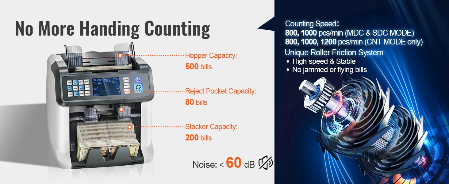 Laskentanopeus on enintään 1200 seteliä minuutissa, joten suuretkin käteissummat voidaan käsitellä lyhyessä ajassa. Syöttölokeron kapasiteetti on 500 seteliä ja pinoamisosan kapasiteetti 200 seteliä, mikä vähentää tarvetta pysähdyksille kesken laskennan.