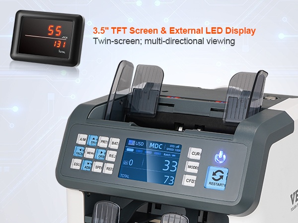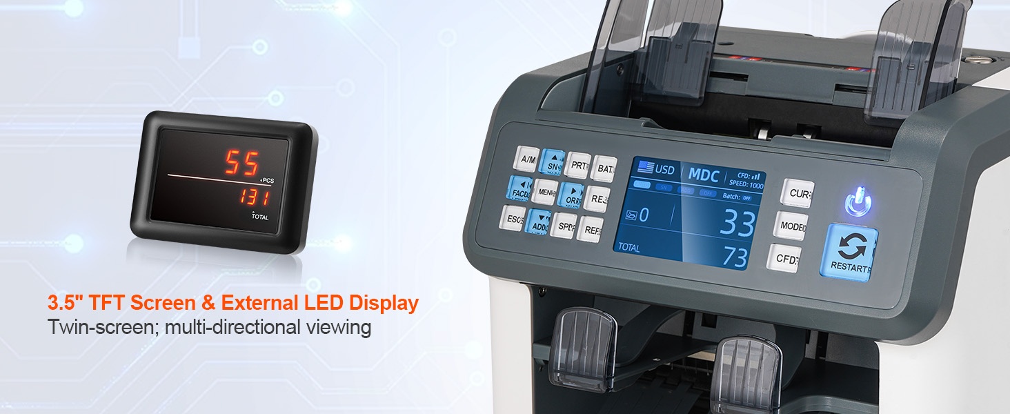 Laite on varustettu suurella LCD-näytöllä sekä ulkoisella LED-näytöllä. Näiden ansiosta sekä käyttäjä että asiakas näkevät laskentatulokset helposti eri katselukulmista, esimerkiksi kassapisteellä.
