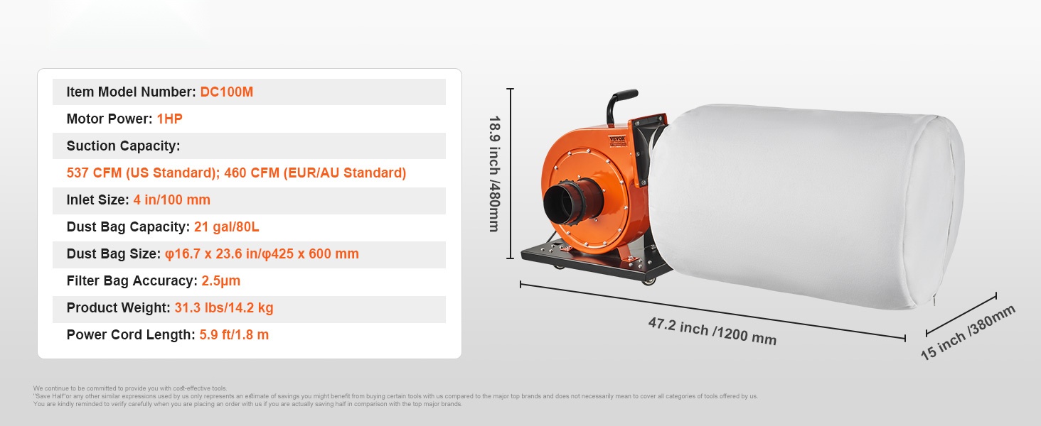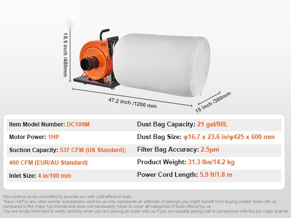 - 4 in/100 mm imuliitäntä, sopii moniin yleisiin puutyökoneisiin.