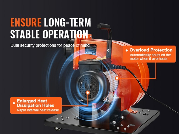 Polyesterinen pölypussi kestää päivittäistä käyttöä sekä lämpöä, ja alareunan vetoketju mahdollistaa pussin tyhjentämisen ilman irrottamista. Jäähdytys ja ylikuormitussuoja auttavat pitämään moottorin toimintavarmana pidempiäkin työrupeamia varten.