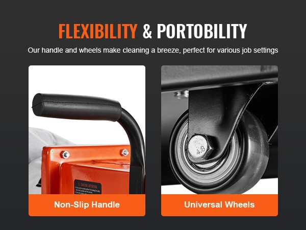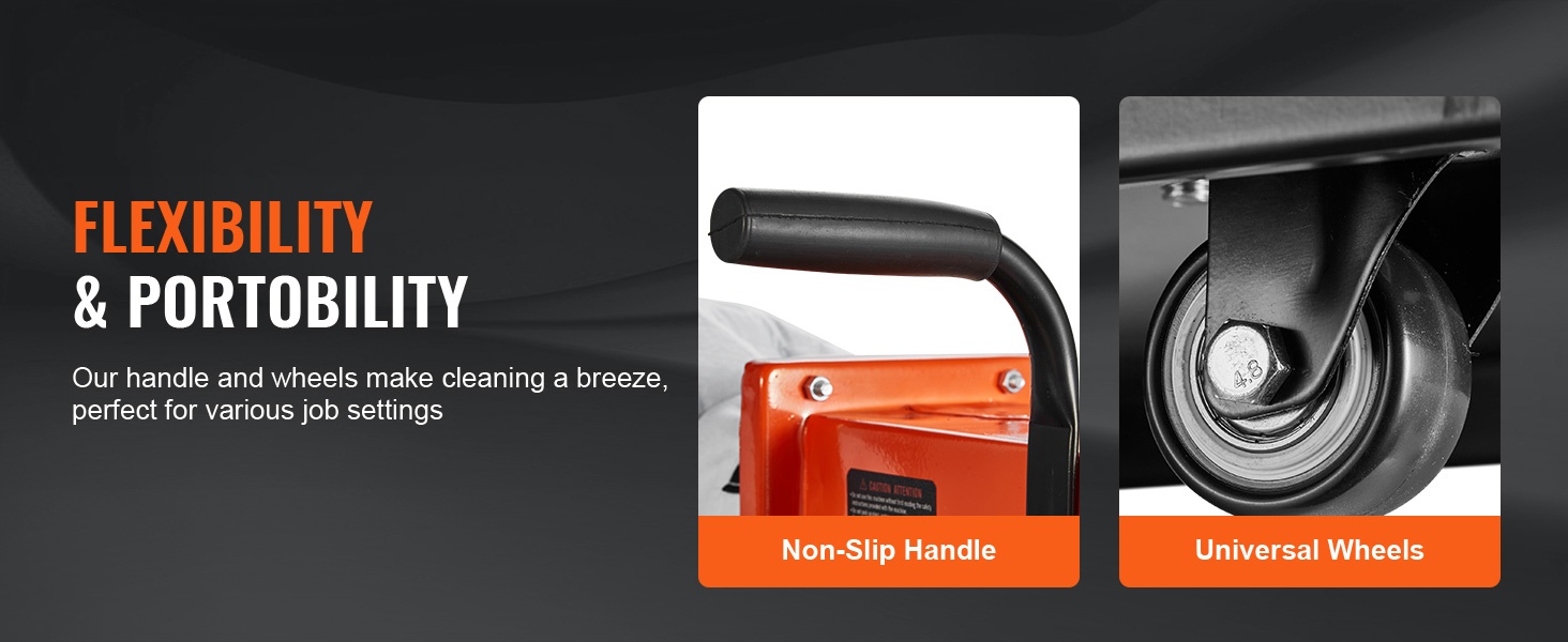 Siirrettävyyttä varten laitteessa on helposti rullaavat pyörät ja kahva, joiden ansiosta pölynkerääjä on helppo viedä aina tarvittavan koneen viereen.