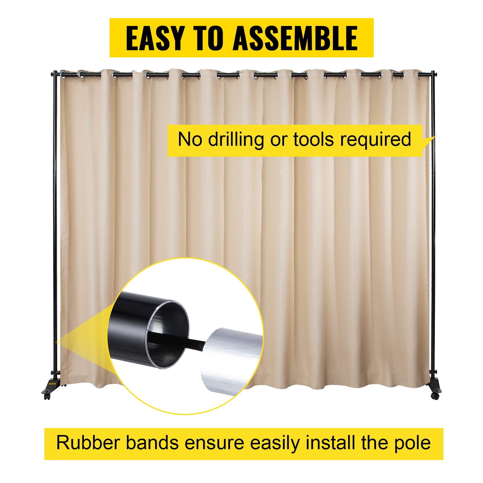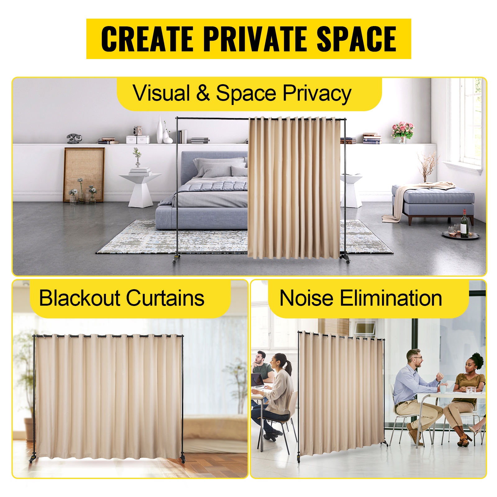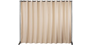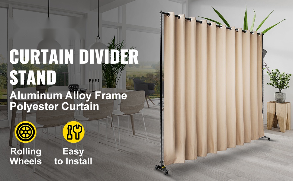 Siirrettävä verhojako pyörillä luo nopeasti yksityisen, 300×257 cm tilan; pimentävä polyesteriverho, kestävä alumiinirunko, 2 jarrullista pyörää, helppo kasata ja kuljettaa Oxford-laukussa.