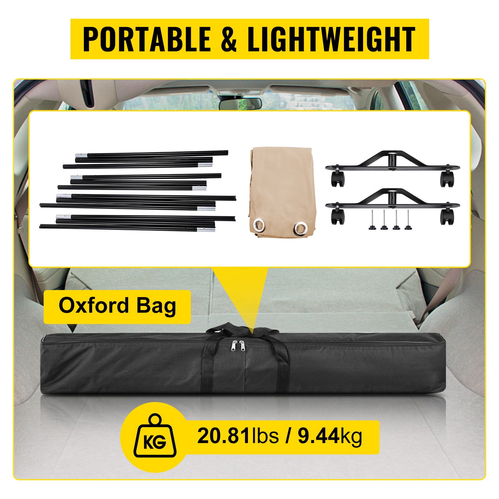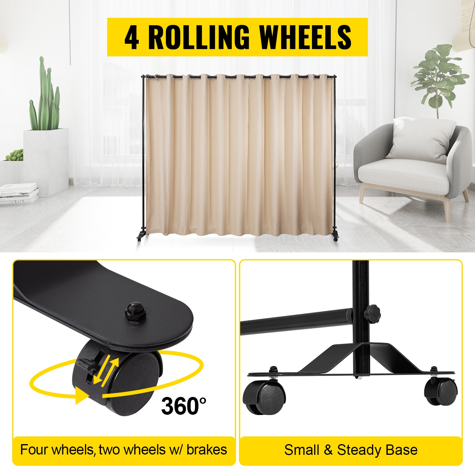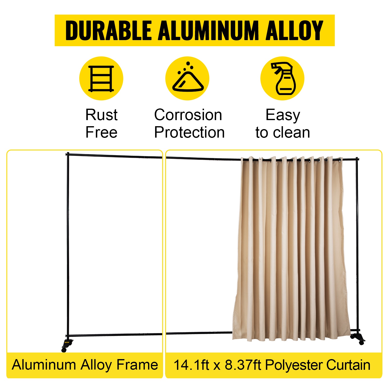 Siirrettävä verhojako pyörillä luo nopeasti yksityisen, 300×257 cm tilan; pimentävä polyesteriverho, kestävä alumiinirunko, 2 jarrullista pyörää, helppo kasata ja kuljettaa Oxford-laukussa.