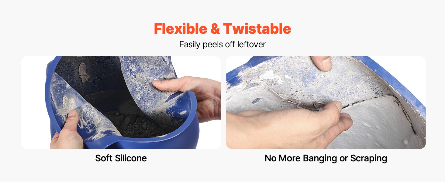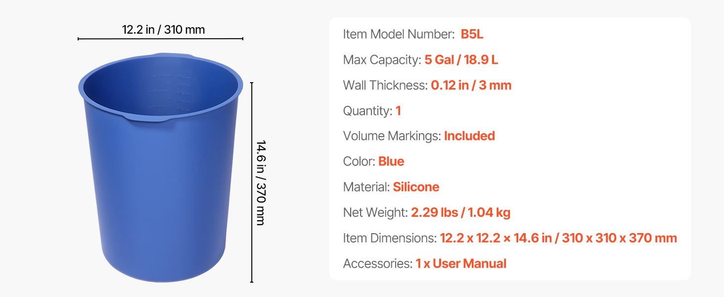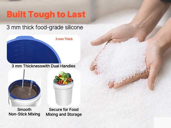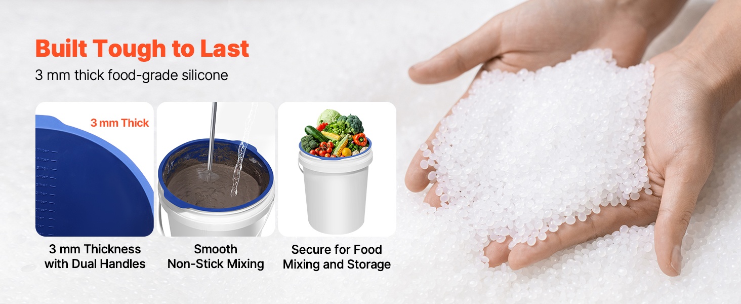 Paksusta silikonista valmistettu sisus istuu tiiviisti vakiokokoiseen 5-gallonan ämpäriin. Tasainen, tarttumaton pinta helpottaa sekoittamista, ja integroidut kahvat helpottavat nostamista ja tyhjentämistä. Materiaali on pitkäikäistä ja suunniteltu toistuvaan käyttöön.