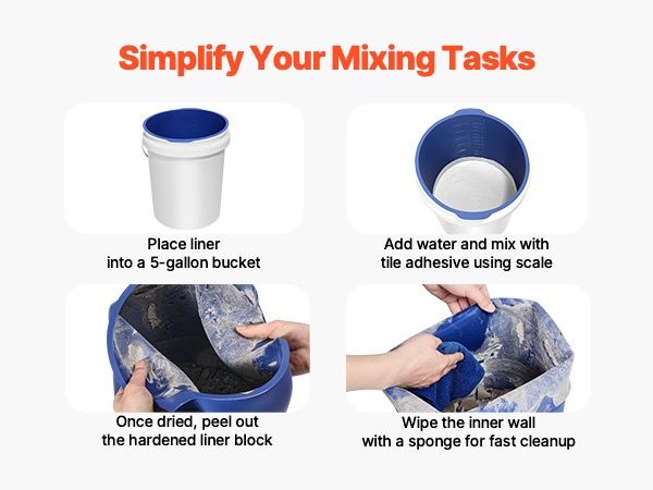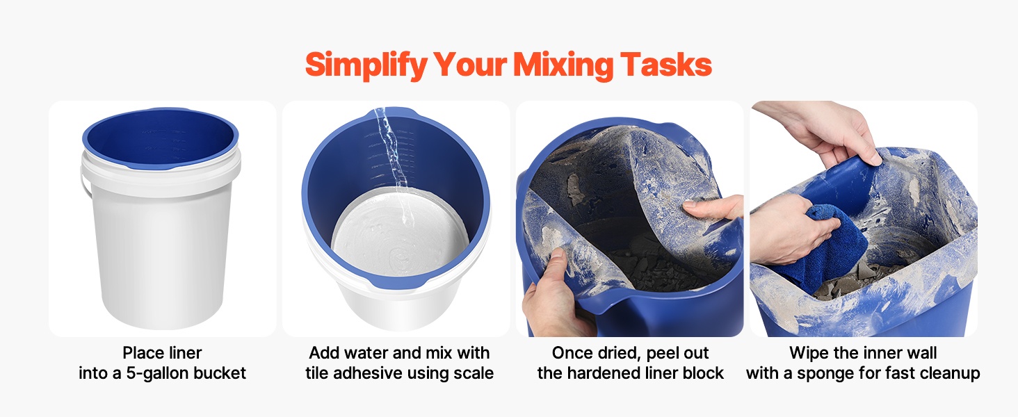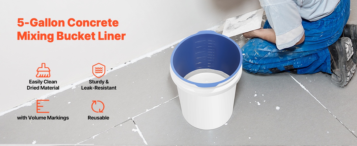 2 kpl 18.9 L piilomuovia sisältävää ämpärinsuojusta betonin sekoittamiseen. Silikoninen, uudelleenkäytettävä laastiämpärin sisäosa helpottaa ohutsaumalaastin, maalin, betonin ja epoksin sekoittamista. Sisäosat sopivat vakiokokoiseen 5-gallonan / 18.9 L ämpäriin, niissä on selkeät mitta-asteikot ja tukevat kahvat, jotka helpottavat käyttöä työmaalla ja kotiremonteissa.