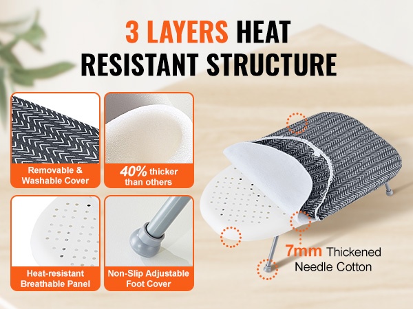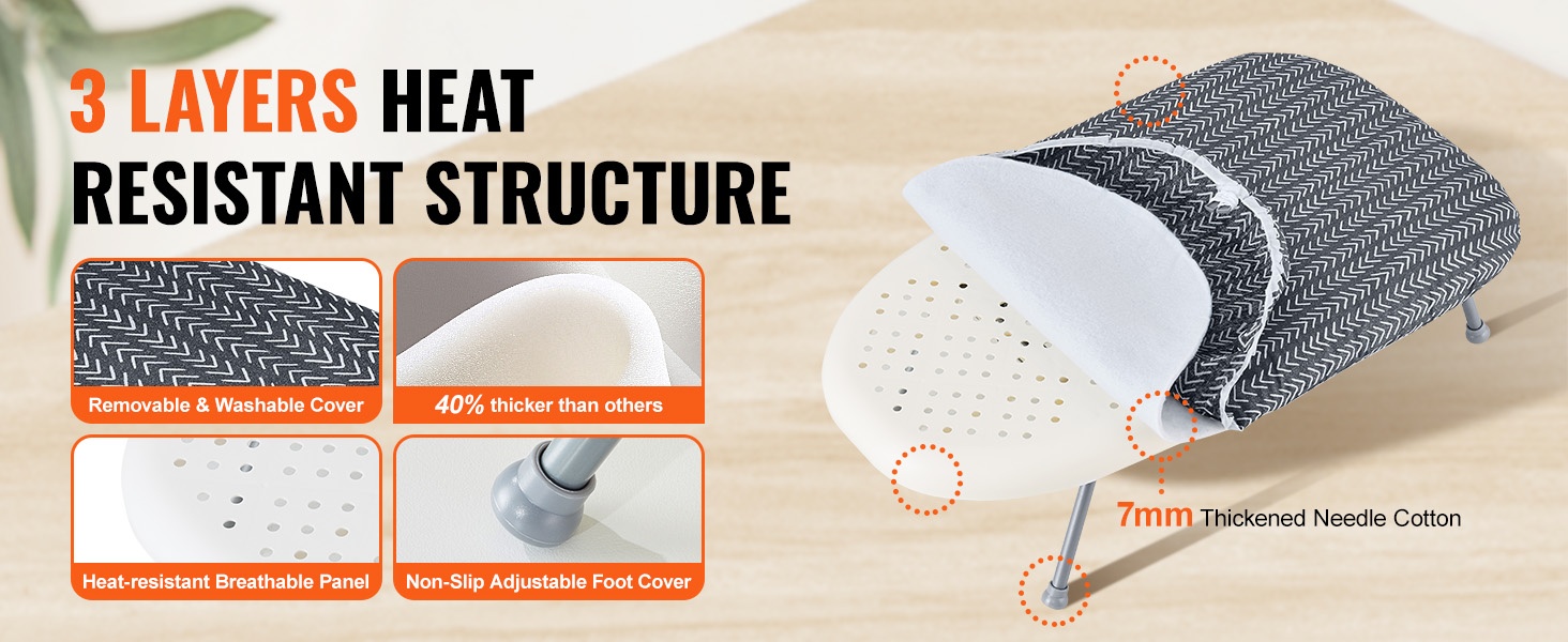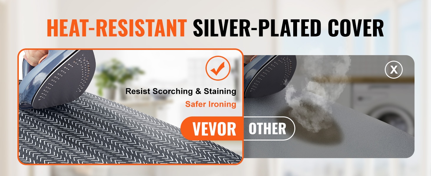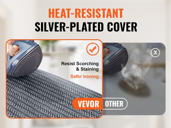 Lämmönkestävä, hopeapinnoitettu päällinen auttaa ehkäisemään kiilto- ja palojälkiä sekä takaa tasaisen silitystuloksen. Voit tarvittaessa laskea kuuman silitysraudan hetkeksi laudalle ilman huolta palamisjäljistä.