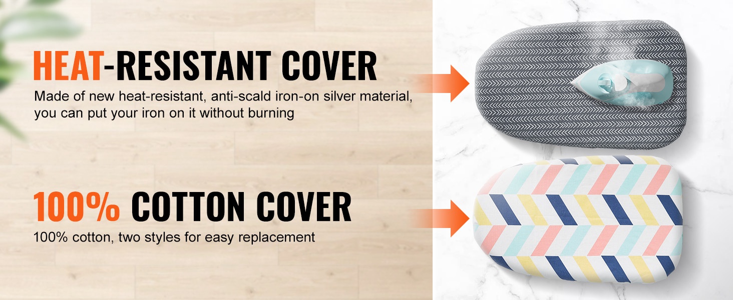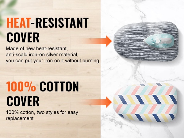 Pakkaukseen sisältyy kaksi päällistä: yksi lämmönkestävä päällinen ja yksi 100% puuvillapäällinen. Puuvillapäällinen tarjoaa sileän ja pehmeän pinnan, joka sopii erityisen hyvin herkille ja ohuille tekstiileille. Vaihdettavat päälliset helpottavat myös puhtaanapitoa.