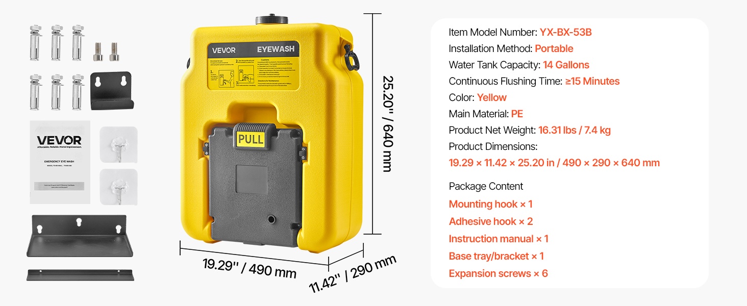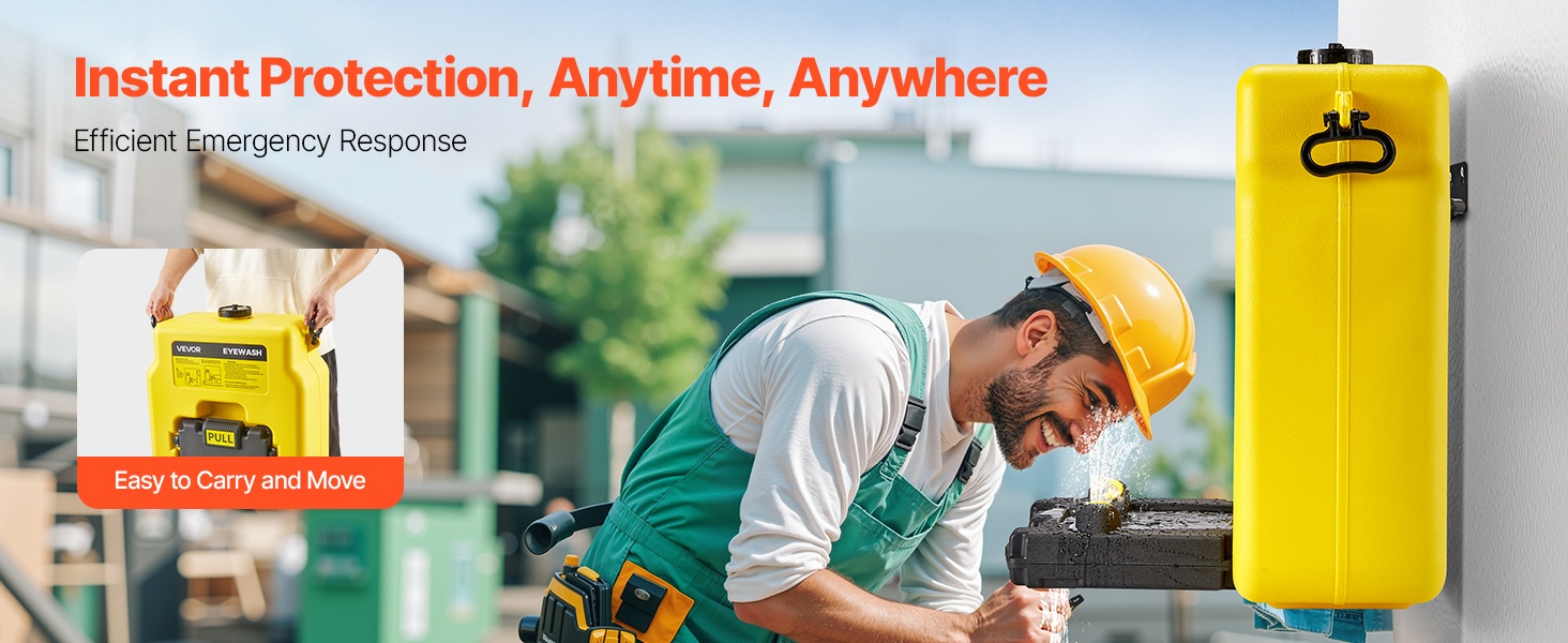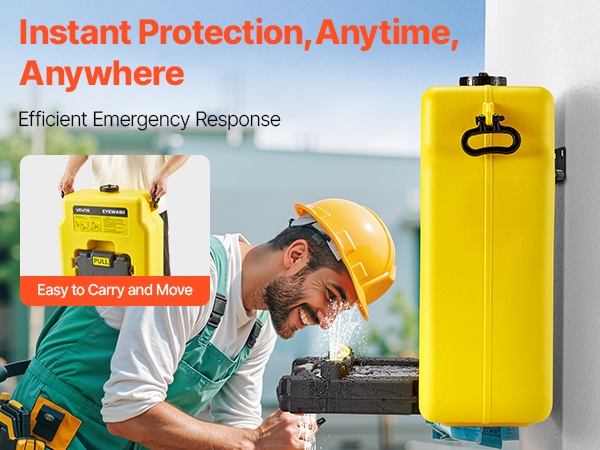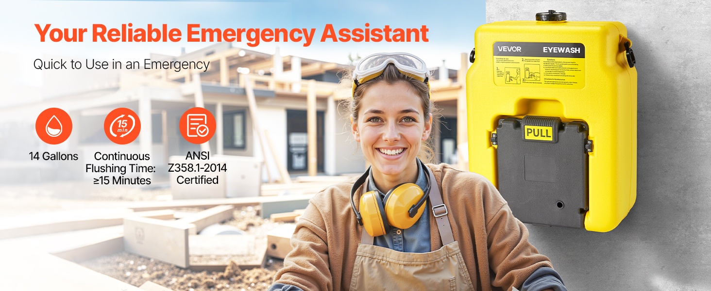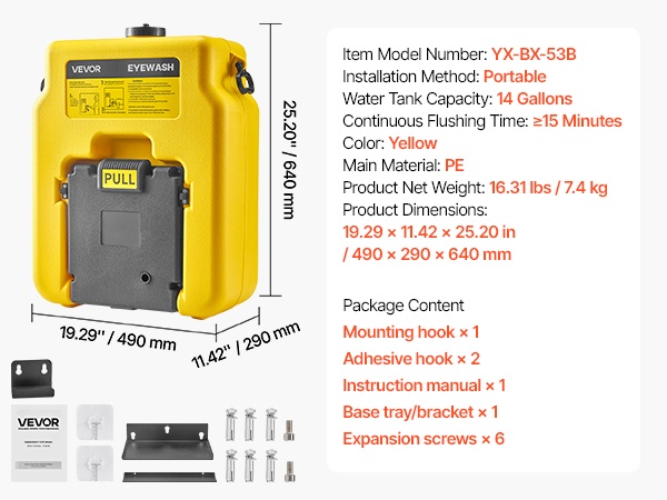 Kannettava hätäsilmänhuuhteluasema, jonka säiliötilavuus on 53L / 14 Gallons. Se on suunniteltu nopeaan ensiapuun tilanteissa, joissa silmiin joutuu kemikaaleja, pölyä tai muita epäpuhtauksia. Laite voidaan asentaa seinälle tai käyttää tasaisella alustalla, ja se soveltuu hyvin koulujen, laboratorioiden, teollisuuslaitosten ja työmaiden tarpeisiin.