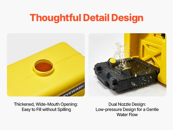 Kaksoissuutin mahdollistaa molempien silmien huuhtelun yhtä aikaa. Matalapainesuunnittelu huuhtelee epäpuhtaudet tehokkaasti ilman liiallisesta vedenpaineesta aiheutuvaa lisähaittaa, mikä lisää käyttömukavuutta ja turvallisuutta huuhtelun aikana.