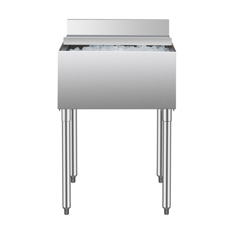 Tämä baaritiskin alle asennettava jäälokero on valmistettu elintarvikelaatuisesta 304-ruostumattomasta teräksestä. Sekä sisäallas että kansi on valmistettu samasta materiaalista, mikä parantaa kestävyyttä ja helpottaa puhtaanapitoa. Tuote on NSF-sertifioitu, mikä tukee turvallista käyttöä ammattilaisympäristöissä.