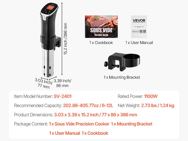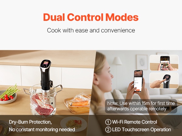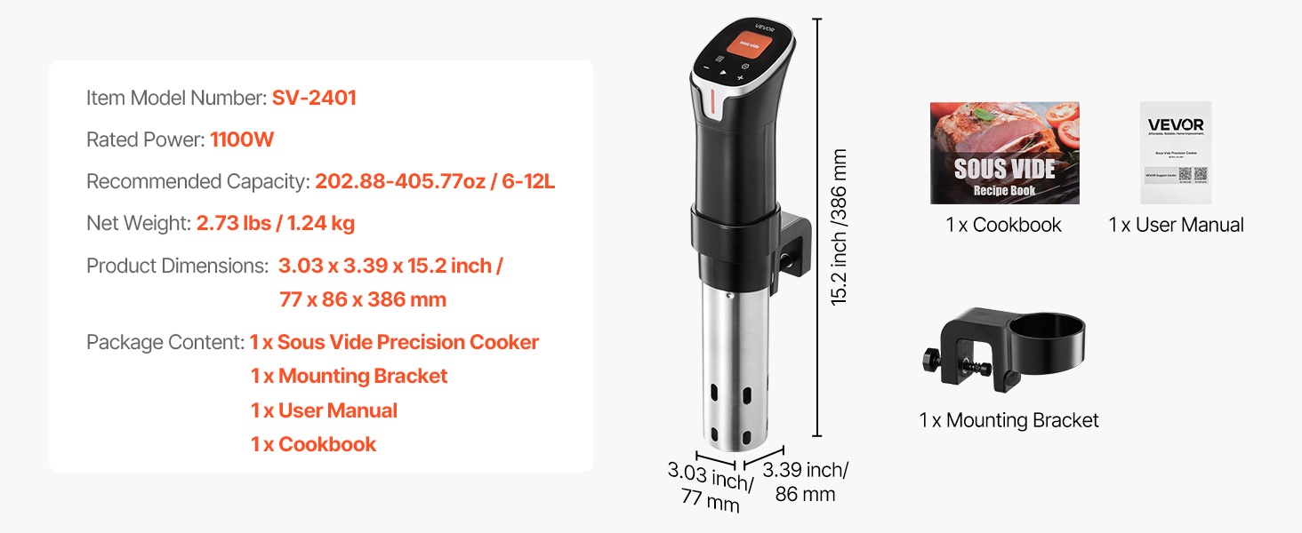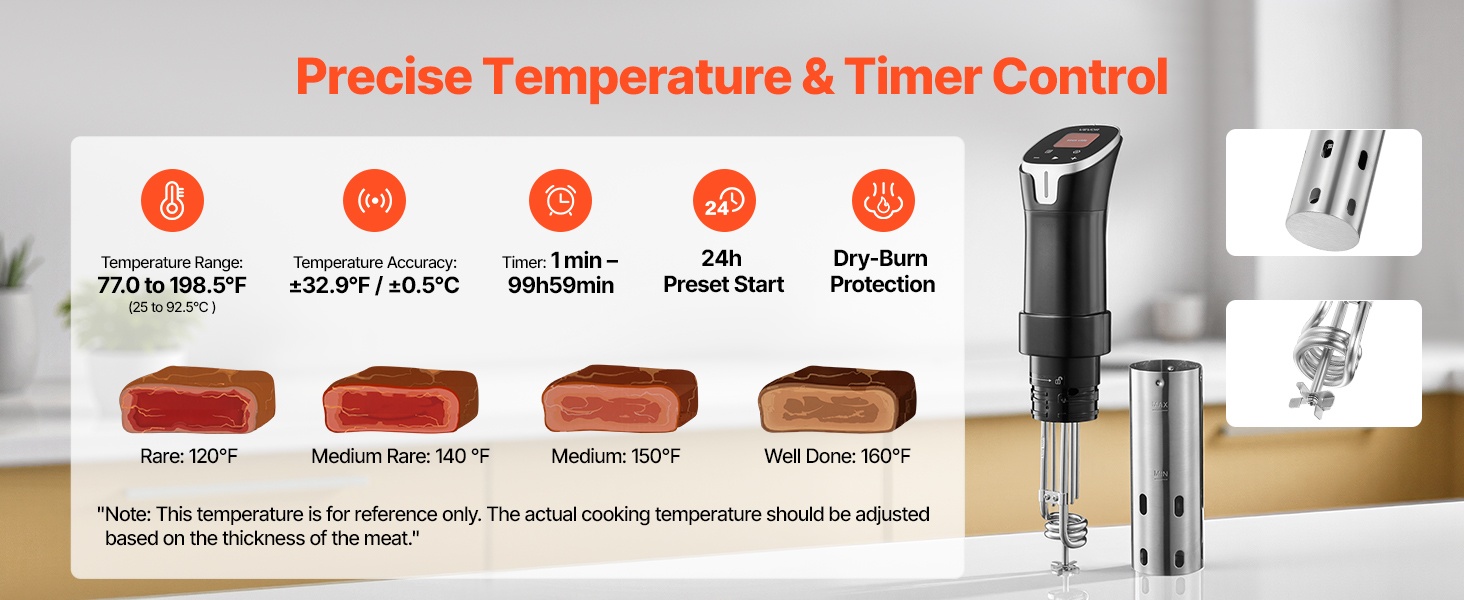 Lämpötila-alue 77.0°F–198.5°F (25°C–92.5°C) ja ±0.1°C tarkkuus mahdollistavat hyvin tarkan kypsennyksen eri raaka-aineille. Ajastin kattaa 1 minuutista 99 tuntiin ja 59 minuuttiin, joten voit valita kypsennysajan sekä lyhyille että hyvin pitkille sous vide -kypsennyksille.