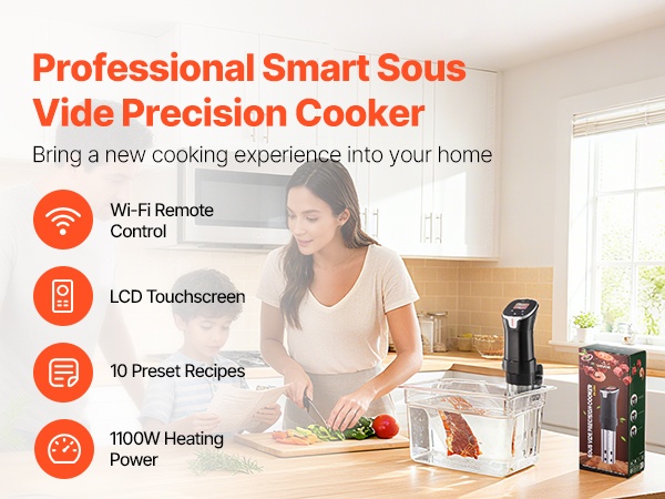 Monipuolinen sous vide -kierrättäjä tarkkaan lämpötilan hallintaan, tasaisiin kypsennystuloksiin ja helppoon arjen ruoanlaittoon. Sopii esimerkiksi lihalle, kalalle, äyriäisille, vihanneksille ja kananmunille.