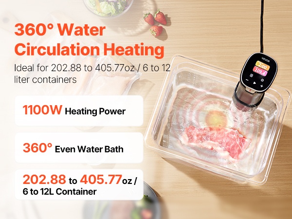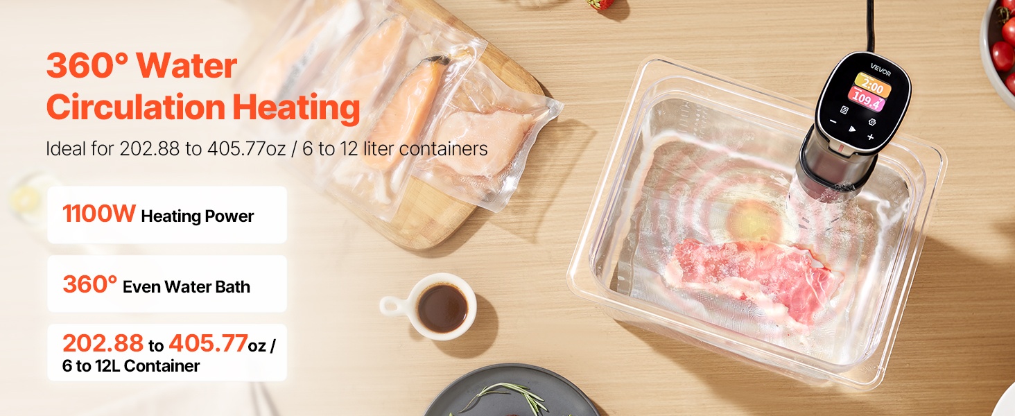 Sous vide -kierrättäjä pitää veden lämpötilan tasaisena koko kypsennysajan, mikä auttaa säilyttämään ruoan mehukkuuden ja rakenteen. Laitteen 1100W teho ja 3000 r/min spiraalikierto varmistavat, että lämpö jakautuu tasaisesti esimerkiksi 6–12 L astioissa, myös paksummissa lihapaloissa.