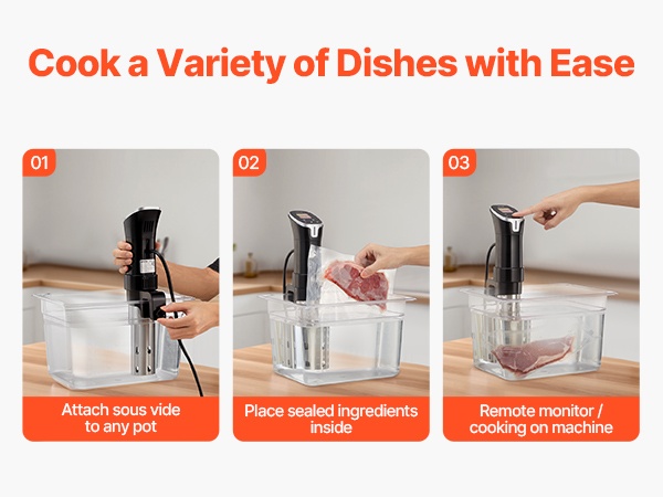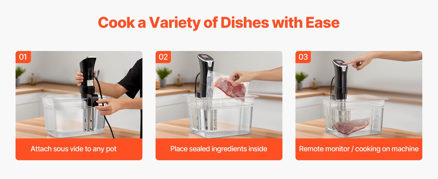 Käyttö etenee kolmessa perusvaiheessa: kiinnitä laite astiaan, lisää veteen suljetut ainekset ja aseta aika sekä lämpötila kosketuspaneelista tai sovelluksesta. Erityisiä ammattitaitoja ei tarvita, joten esimerkiksi pihvit, kala ja vihannekset on helppo kypsentää tarkasti.