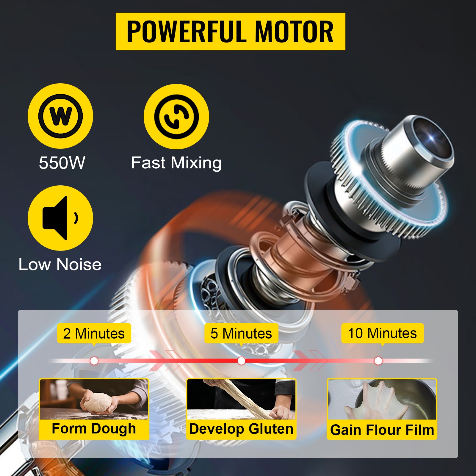 Taikinakoneessa on 550W moottori, joka tarjoaa vahvan väännön ja tasaisen sekoituksen matalalla melutasolla. Rakenne on suunniteltu pitkäaikaiseen, luotettavaan käyttöön.