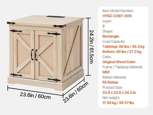 Pöydän runko ja kansi on valmistettu MDF-levystä, ja ulkopinta on punottua PE-rottinkia. Kansi kestää enintään 80 lbs / 36.3 kg ja alempi taso 60 lbs / 27.2 kg, joten pöytä soveltuu hyvin päivittäiseen käyttöön olohuoneessa, makuuhuoneessa tai pienissä tiloissa.