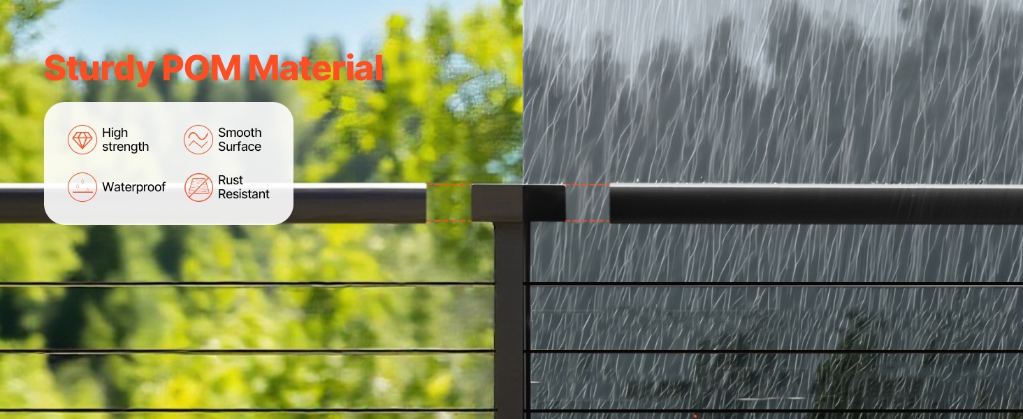 Liitin on valmistettu lujasta POM-materiaalista. Pinta on sileä, vedenpitävä ja ruostumaton, ja kestää vaativia sääolosuhteita tarjoten pitkäaikaista tukea kaiteille.