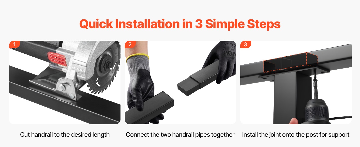 Liittimet on helppo asentaa ilman monimutkaisia työkaluja tai taitoja. Kaiteen katkaisu ja liittimen kiinnitys sujuvat nopeasti, joten tuote sopii hyvin myös aloittelijoille.