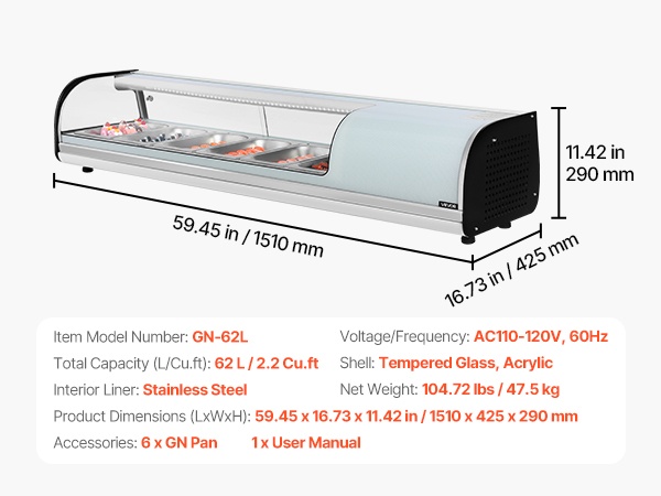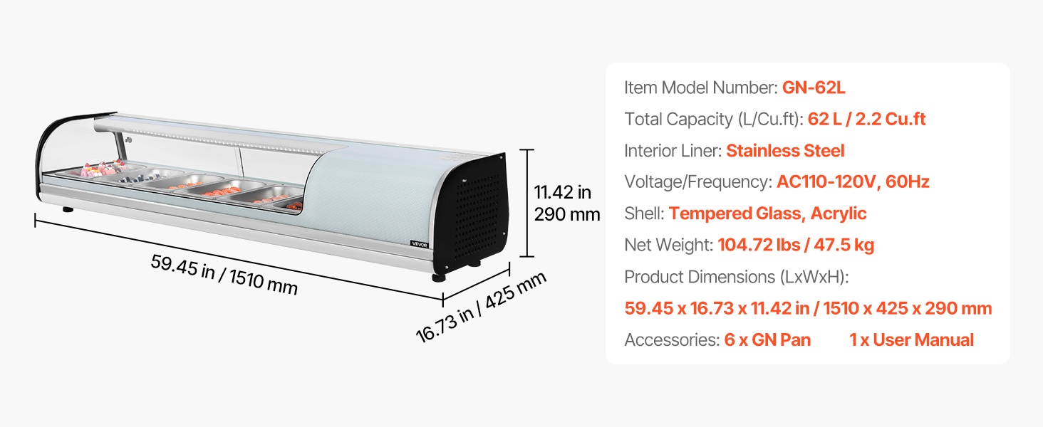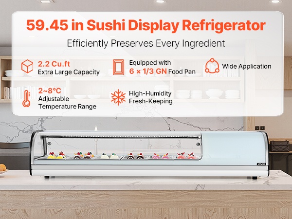 62L kylmäsäilytystilaa, 6 x 1/3 GN ruostumattomia astioita, digitaalinen 2–8°C säätö, kaareva karkaistu lasi, LED-valaistus, takaliukuovet, ruosteterässisustus, kestävä, ihanteellinen sushibaareihin ja myymälöihin.