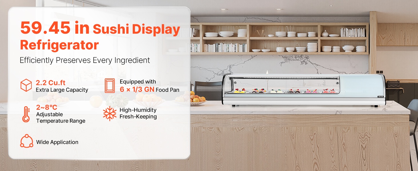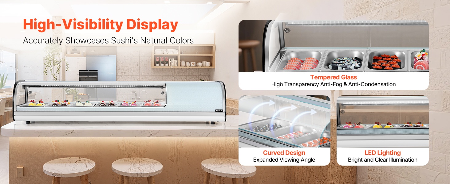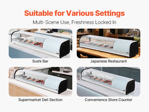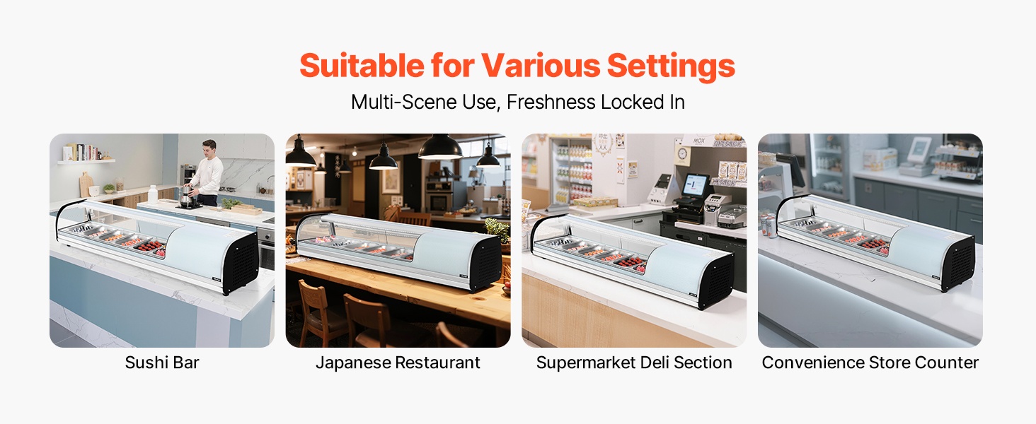 Vitriini sopii sushibaareihin, japanilaisiin ravintoloihin, supermarketteihin ja lähikauppoihin. Se esittelee sushiannokset, sashimin, juustot ja jälkiruoat selkeästi, säilyttää niiden tuoreuden ja tukee monenlaisia ammattikeittiöiden ja myymälöiden tilaratkaisuja.