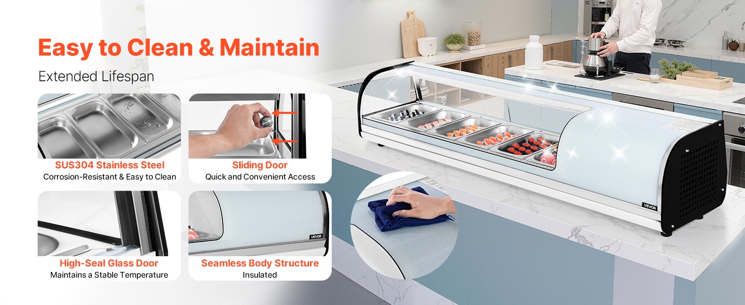 Tämä sushi-vitriini tarjoaa 62L tilavuutta ja sisältää 6 x 1/3 GN -ruostumattomasta teräksestä valmistettua astiaa. Lämpötila-alue on 35.6–46.4℉ (2–8℃). Kaareva karkaistu lasi ja LED-valaistus varmistavat selkeän esillepanon, ja takapuolen liukuovet helpottavat käyttöä sushibaareissa, ravintoloissa ja myymälöissä.