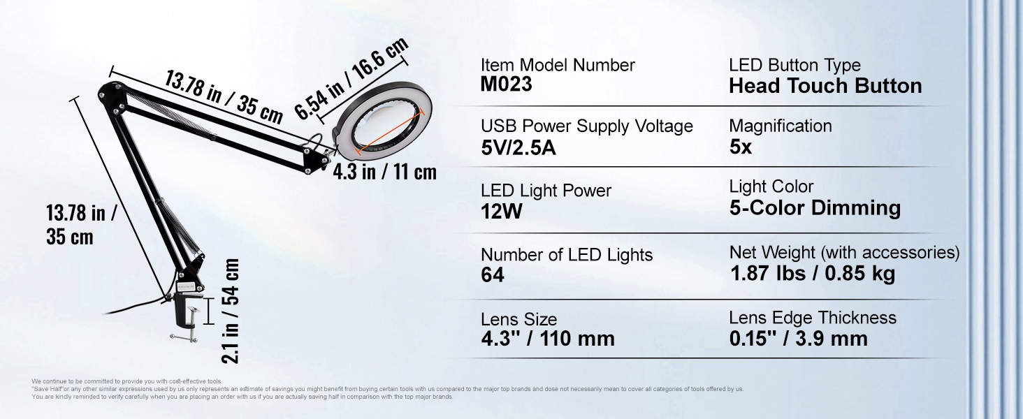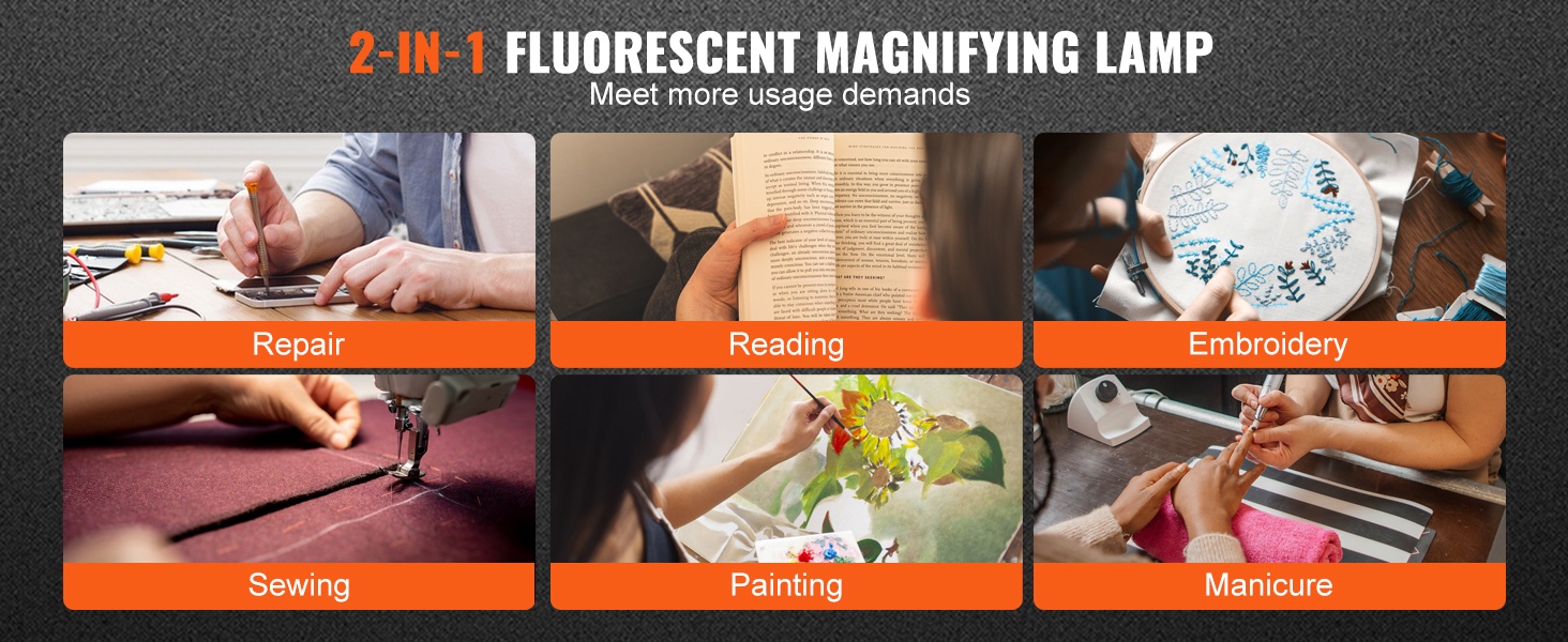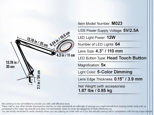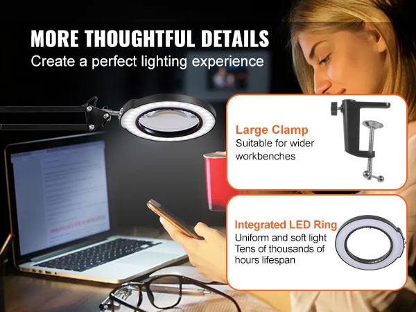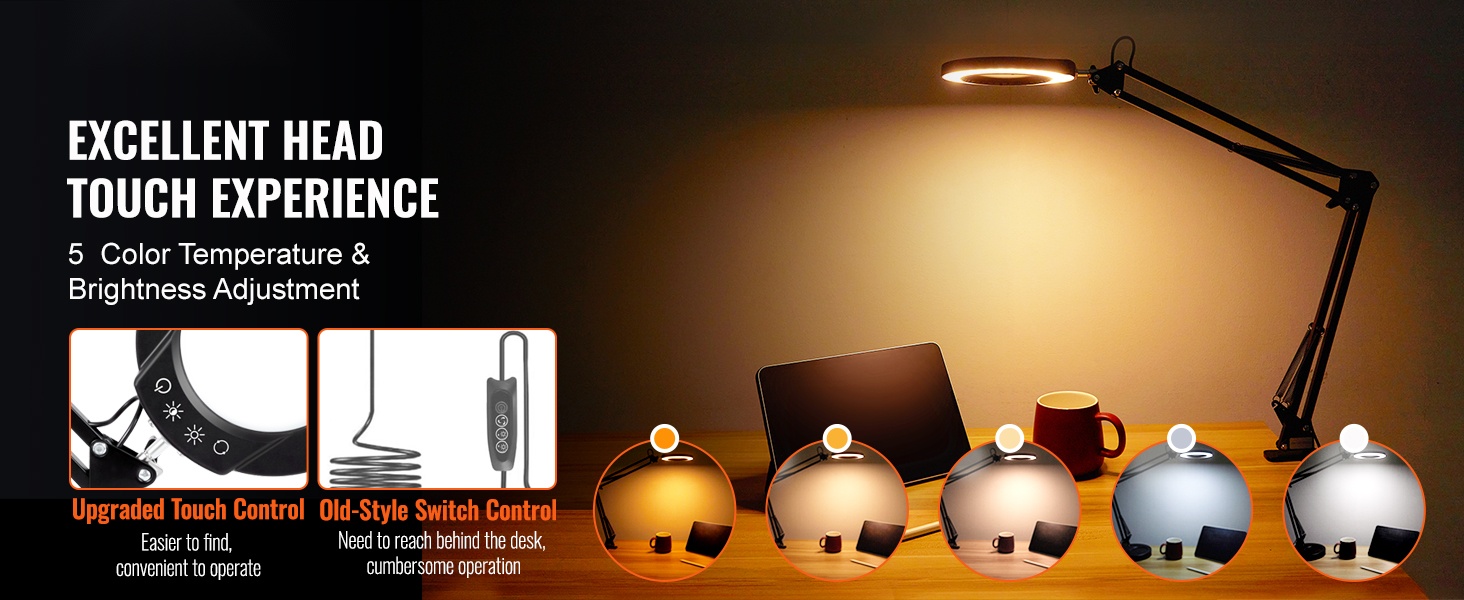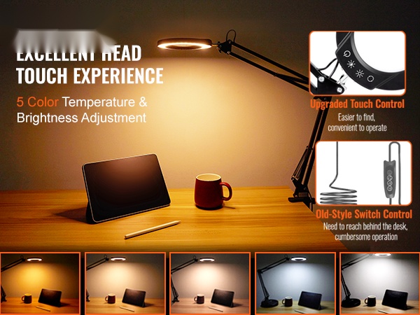 Suurennuslasin valo tarjoaa 5 tasoa värilämpötilaa ja 5 tasoa kirkkaudensäätöä. Voit säätää valon sävyn ja kirkkauden lukemista, opiskelua, työskentelyä tai yleisvalaisua varten, jotta yksityiskohdat näkyvät selkeästi ilman häikäisyä.