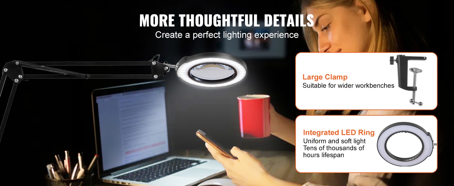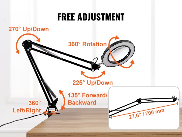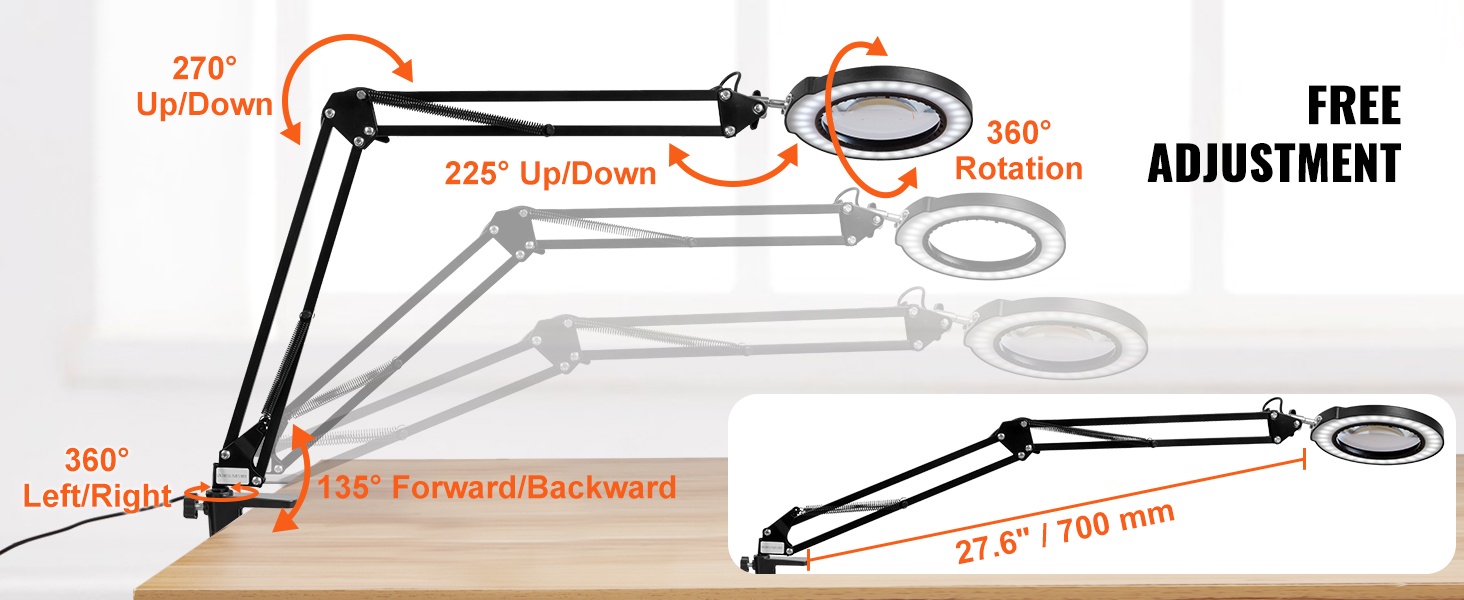 Suurennuslasin ja varren joustava liike mahdollistaa valon ja suurennuksen suuntaamisen juuri sinne, missä sitä tarvitaan. Pidempi, säädettävä varsi helpottaa asennon vaihtamista ilman, että joudut siirtämään koko lamppua. Tämä vähentää silmien rasitusta ja tukee keskittynyttä työskentelyä.