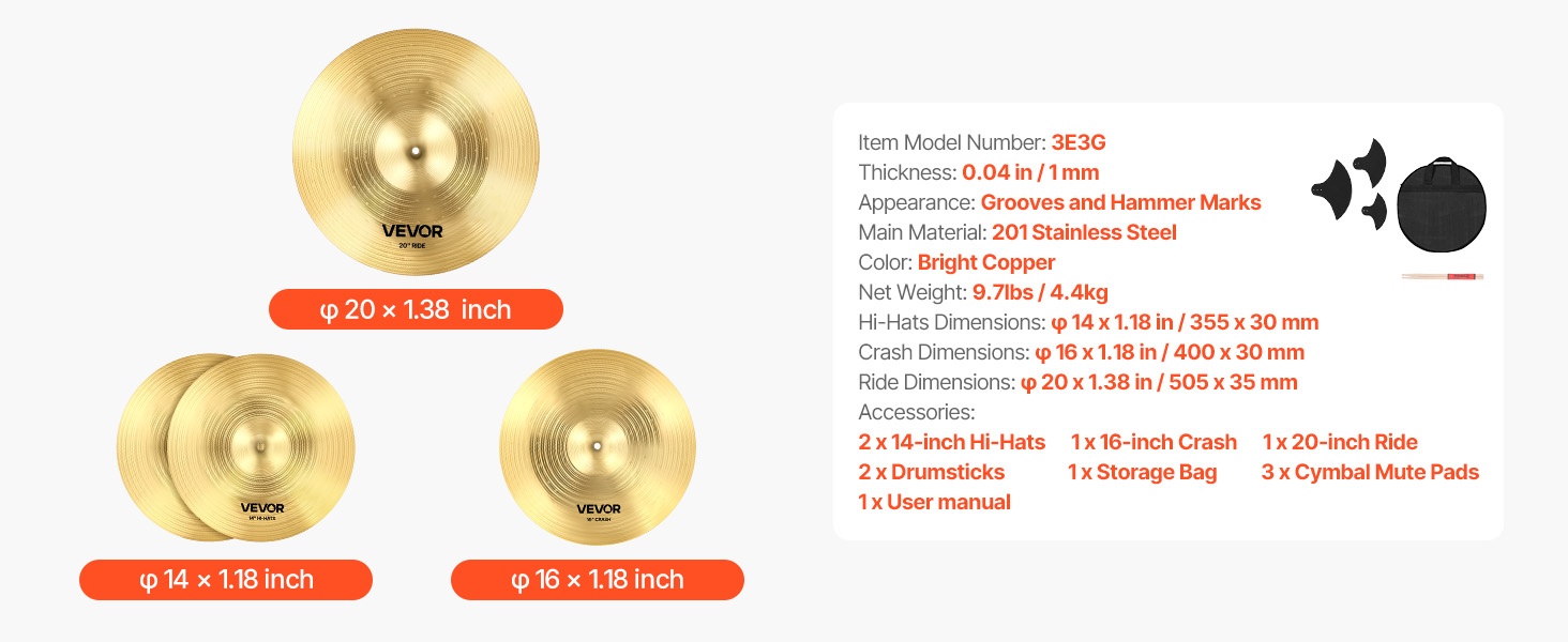 Tässä symbaalipaketissa on 4 symbaalia: 14-tuumainen hi-hat, 16-tuumainen crash, 20-tuumainen ride ja 10-tuumainen splash. Mukana tulee lisäksi 2 rumpukapulaa, 1 säilytyslaukku ja 4 vaimennusmattoa. Kirkas sointi ja monipuolinen käyttö tekevät setistä sopivan erityisesti aloitteleville rumpaleille.