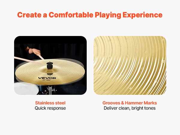 Symbaalit on valmistettu kestävästä seoksesta, ja niiden paksuus on 1 mm, mikä mahdollistaa nopean vasteen säilyttäen samalla tukevan rakenteen. Urakuviot ja vasarointijäljet tukevat puhdasta, kirkasta sointia ja tarjoavat miellyttävän soitettavuuden.