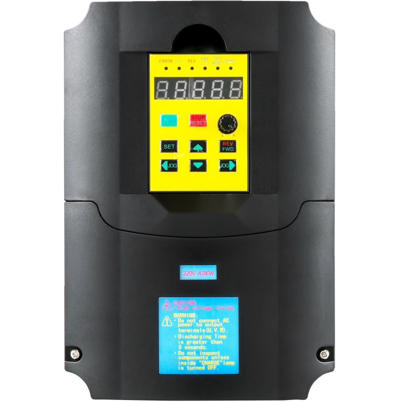 4 kW taajuusmuuttaja moottorin nopeuden ohjaukseen. Soveltuu sekä vakio- että muuttuvavääntöisille kuormille, kuten kompressoreille, puhaltimille, pumpuille ja sekoittimille. Syöttönä 1 tai 3-vaiheinen 220V AC, lähtönä 3-vaiheinen, joten laite toimii myös vaiheenkääntäjänä. Taajuusmuuttajassa käytetään Sine wave PWN (SVPWM) -ohjausmenetelmää vakaan ja tarkan toiminnan saavuttamiseksi. Tuote on CE-hyväksytty.