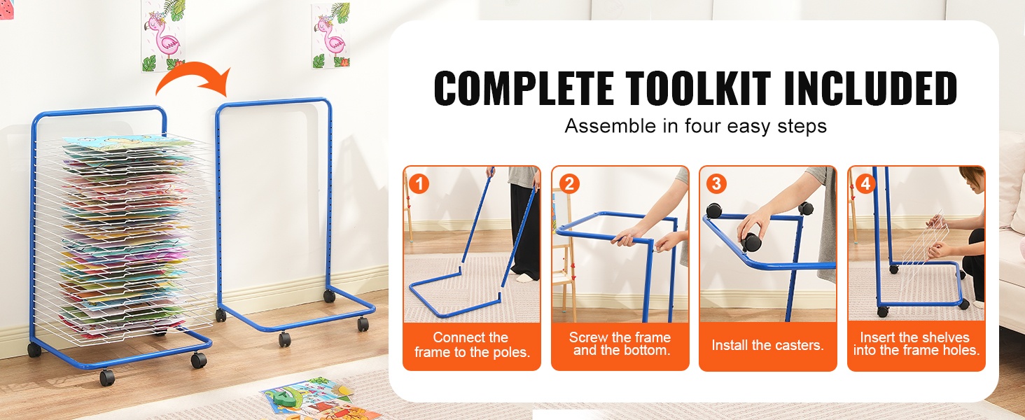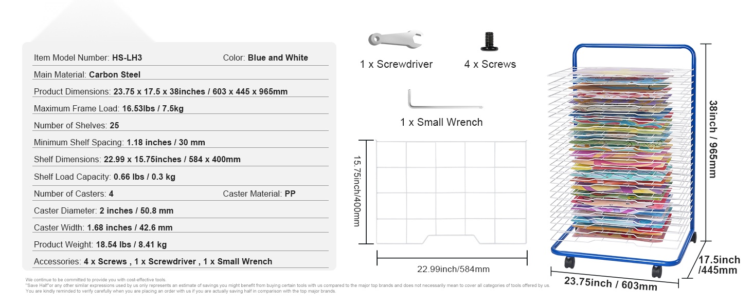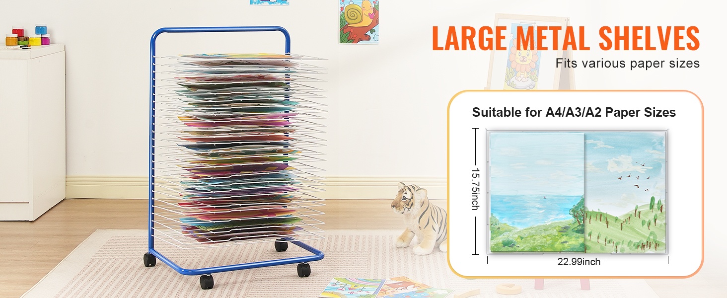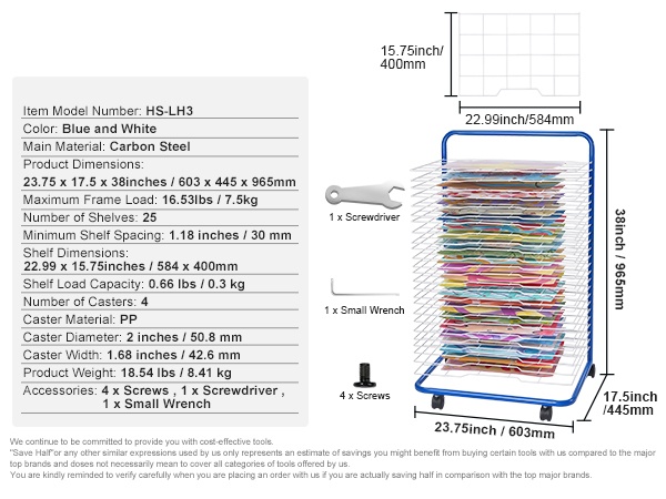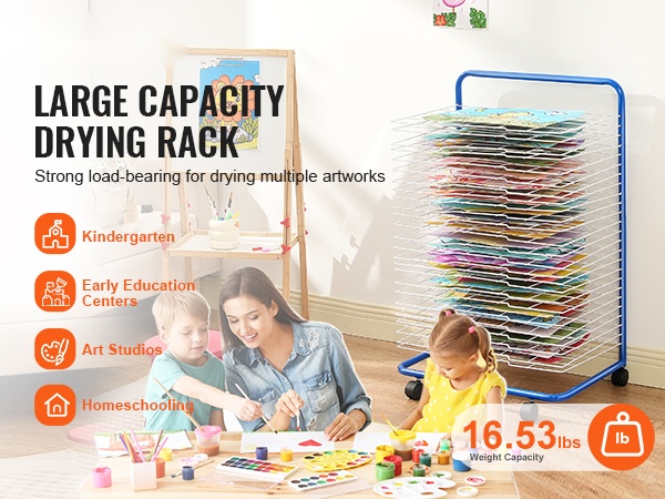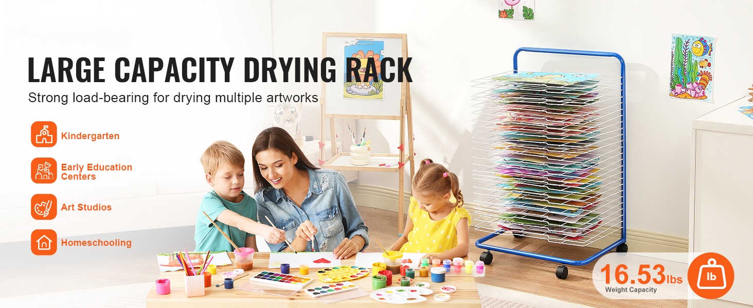 Telineen kantokyky on 16.53 lbs, joten se soveltuu useiden töiden samanaikaiseen kuivaamiseen ja säilyttämiseen. Avoin rakenne pitää ilman kiertämässä ja nopeuttaa kuivumista. Sopii hyvin kouluihin, päiväkoteihin, taidestudioihin ja kotiopetukseen, ja se mukautuu erilaisiin töihin, kuten paperille tehdyt piirrokset, käsintehdyt työt ja kankaalle maalatut teokset.