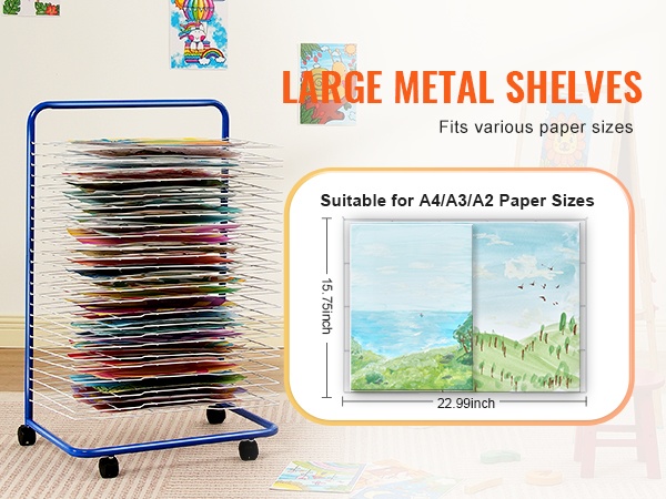 Koko maalausteline on valmistettu metallista, joten se kestää suurenkin määrän töitä ilman taipumista tai vääntymistä. Hyllyille mahtuu erikokoisia papereita, kuten A4, A3 ja A2. Teline pysyy vakaana myös täysin kuormitettuna ilman sortumisriskiä.